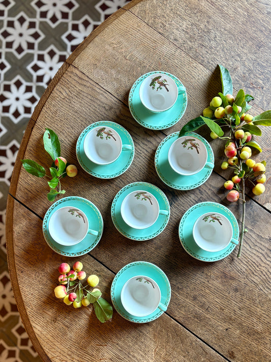 Lot de 7 tasses et soucoupes à café vintage décors d'oiseaux