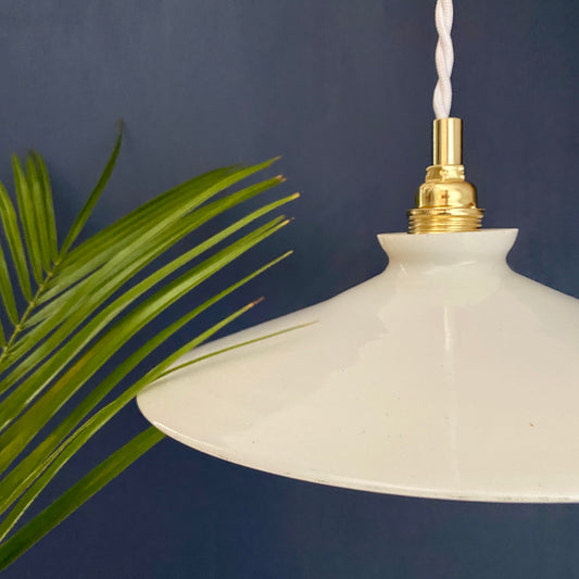 Suspension abat-jour vintage art déco en verre dépoli blanc et doré