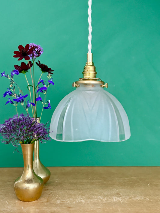 Suspension abat-jour vintage dentelle en verre mi blanc mi transparent