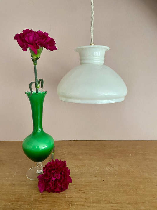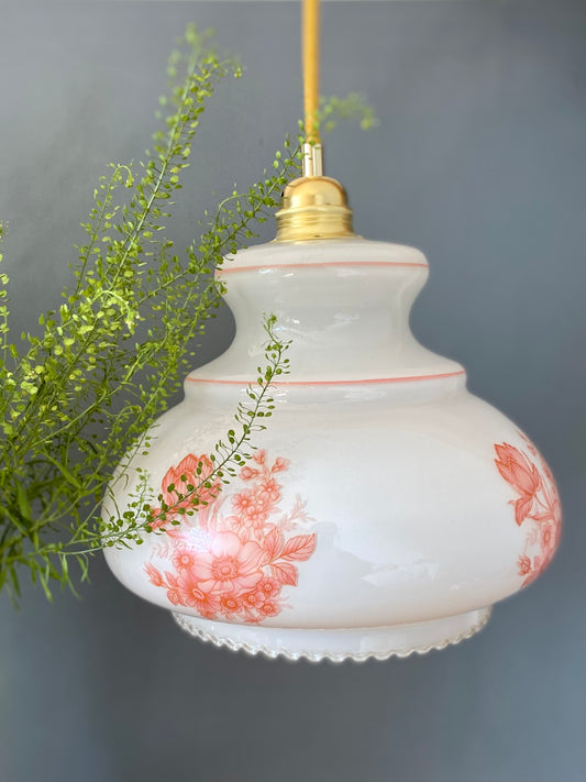 Suspension abat-jour vintage en opaline blanche dessins de fleurs