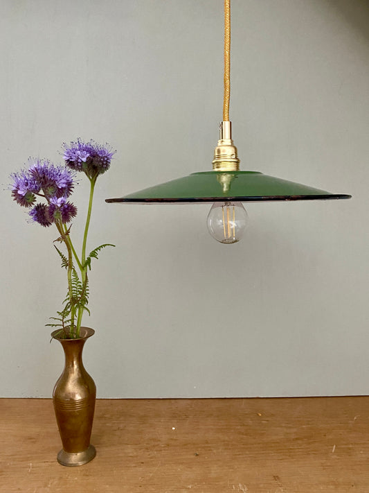 Suspension abat-jour vintage en verre de clichy blanc avec liserés rouge