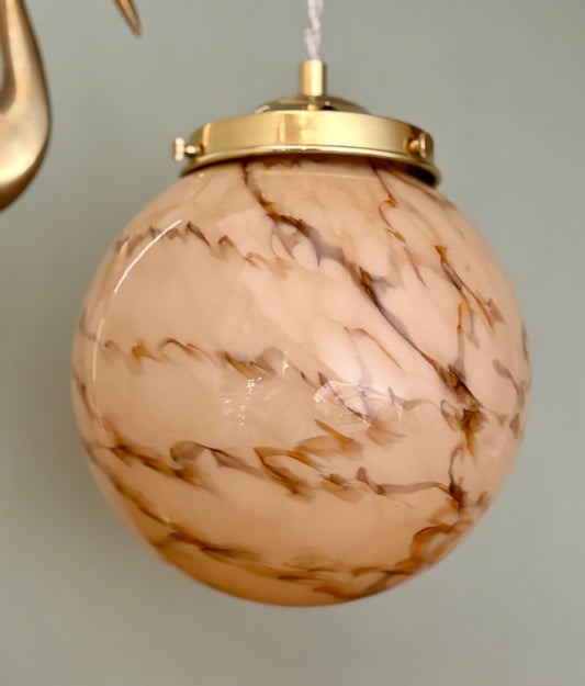 Suspension globe vintage art déco en verre de Clichy rose et doré