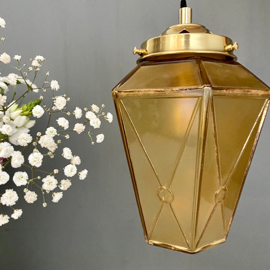 Suspension globe vintage art déco en verre jaune et doré