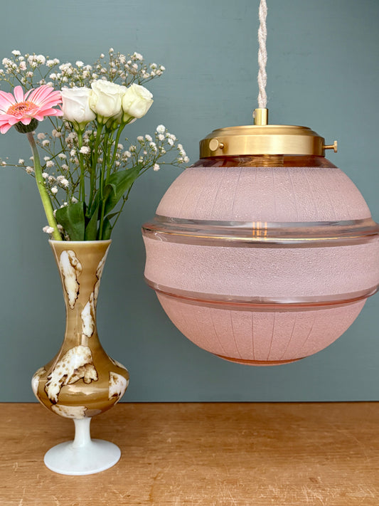 Suspension globe vintage art déco en verre rose et doré