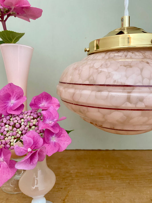 Suspension globe vintage art déco et verre de Clichy rose liserés rouges