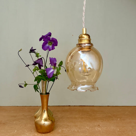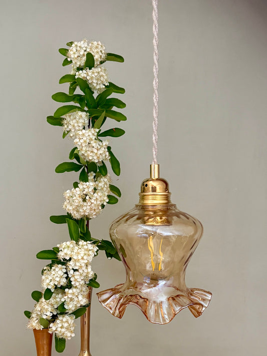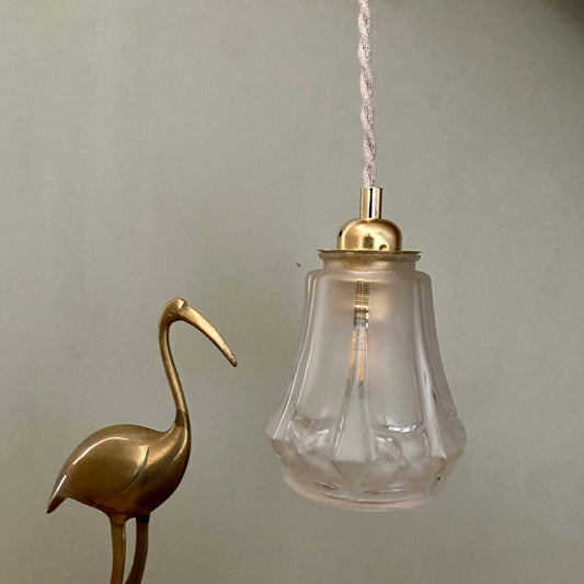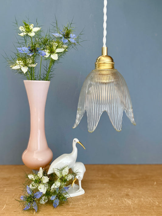 Suspension triple tulipes vintage en verre ciselé et holophane