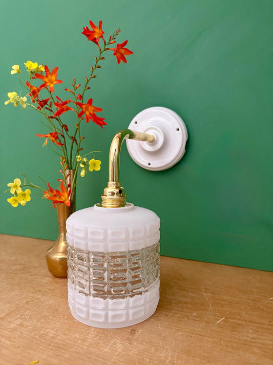 Applique coudée globe vintage en verre blanc et transparent
