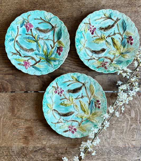 Lot de 3 assiettes anciennes en barbotine décors d'oiseaux