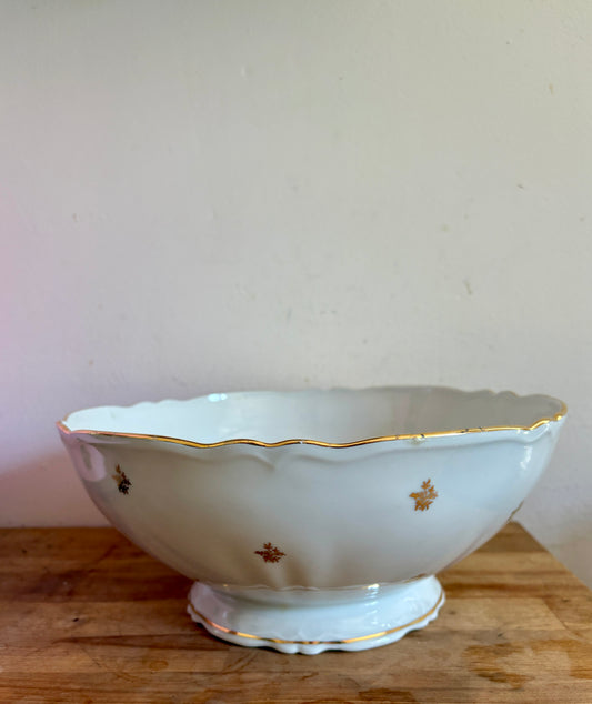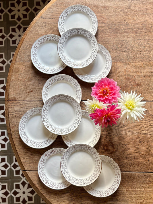 Lot de 12 assiettes plates vintage en demi porcelaine avec détails dorés - L'amandinoise