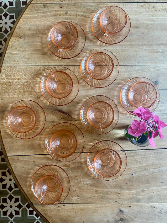 Lot de 10 tasses et soucoupes vintage Arcoroc en rosaline