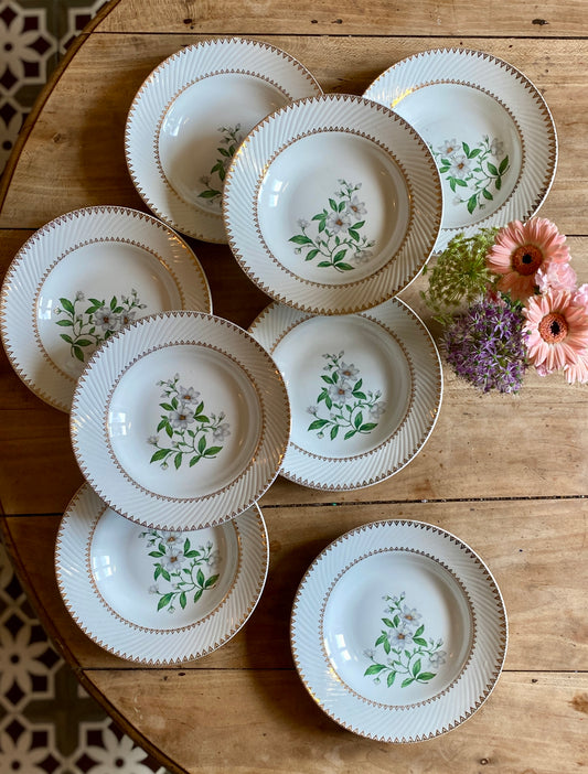 Lot de 8 assiettes creuses vintage, décors de fleurs et bordures dorées