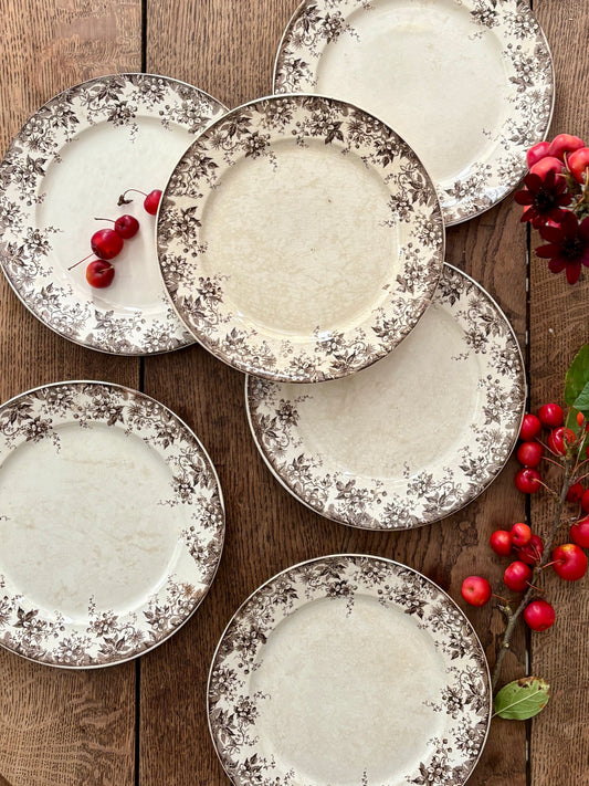 Lot de 6 assiettes plates anciennes en terre de fer modèle Alphand de Sarreguemines
