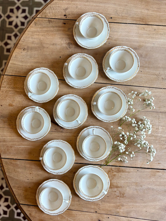 Lot de 11 tasses et soucoupes en porcelaine blanche et dorée