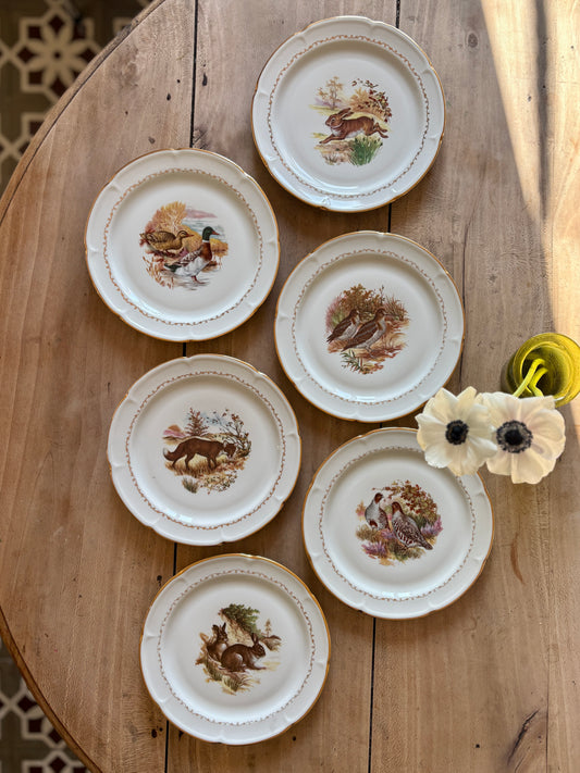 Lot de 6 assiettes à dessert vintage en porcelaine - Gibier -