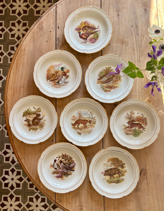 Lot de 8 assiettes creuses vintage en porcelaine - Gibier -