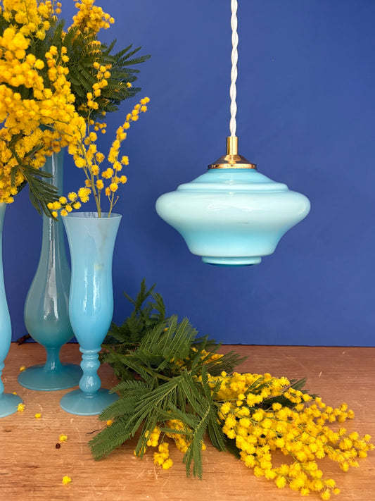 Lampe à poser vintage en céramique bleue et opaline blanche