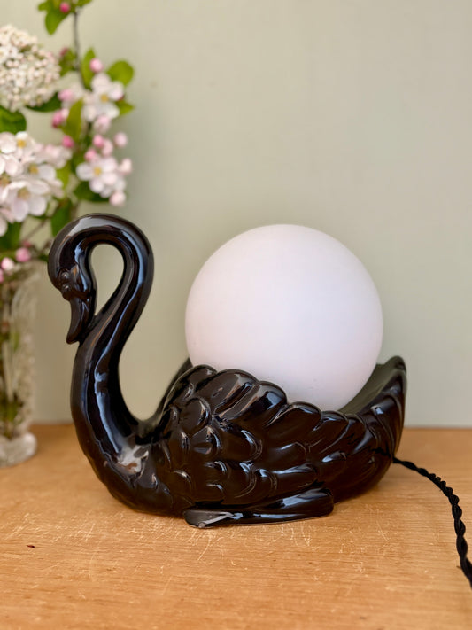 Lampe vintage, cygne noir en céramique et globe en opaline blanche