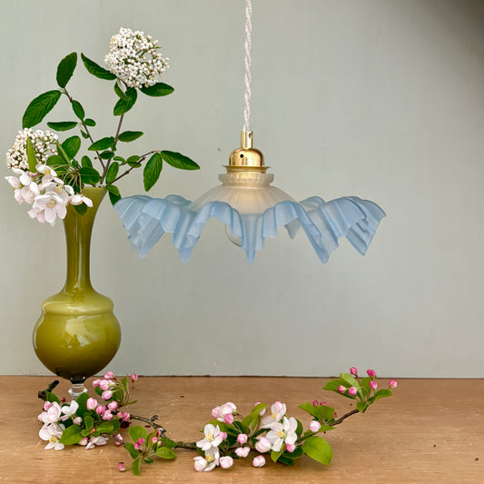 Suspension abat-jour vintage dentelle en verre dépoli bleu