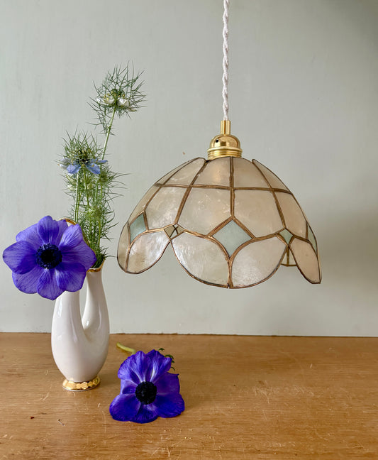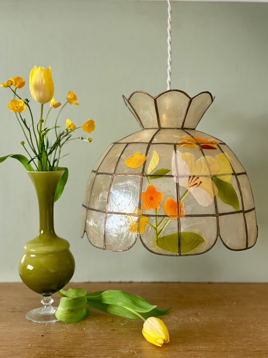 Suspension abat-jour vintage en nacre et laiton décors de fleurs
