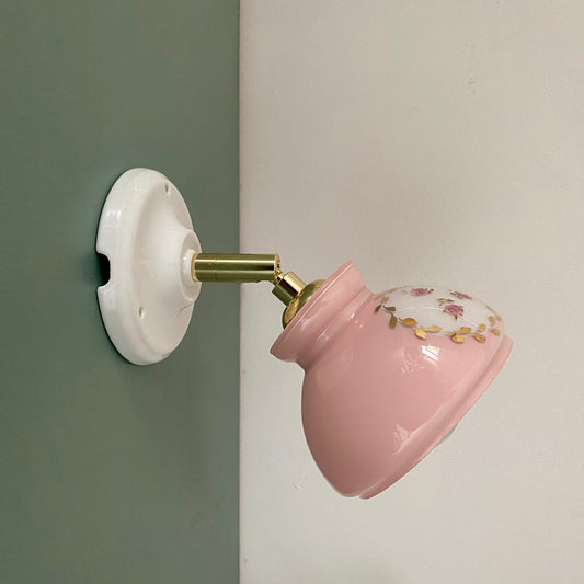 Applique abat-jour vintage en opaline rose dessins de fleurs