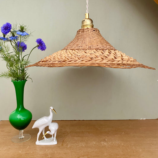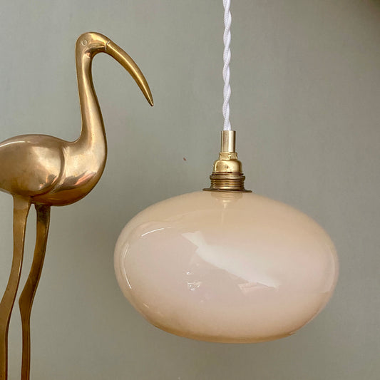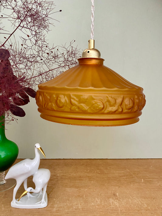 Suspension globe vintage art déco et verre de Clichy rose liserés rouges