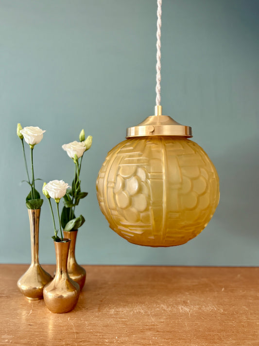 Suspension globe vintage art déco en verre dépoli jaune