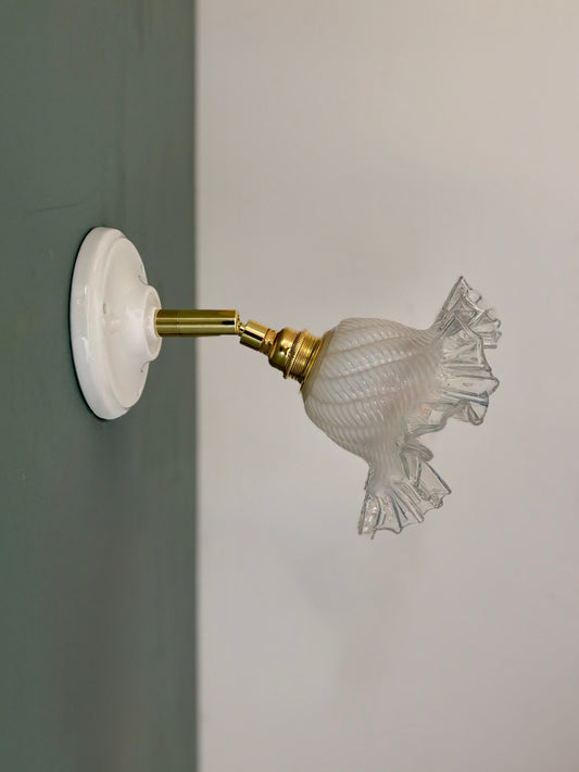 Applique tulipe vintage en verre transparent, blanc légèrement nacré.