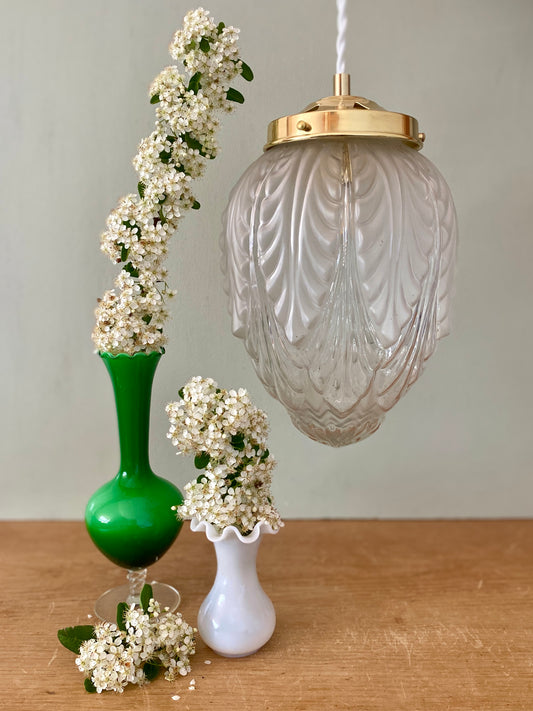 Suspension abat-jour vintage art déco en verre dépoli blanc et doré