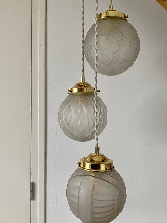 Suspension cascade triple globes vintage art déco en verre dépoli