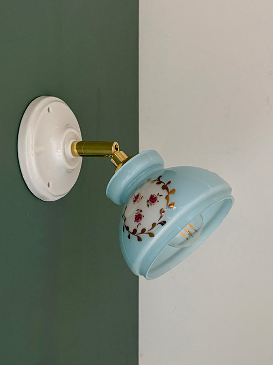 Applique abat-jour vintage en opaline bleue décors de fleurs