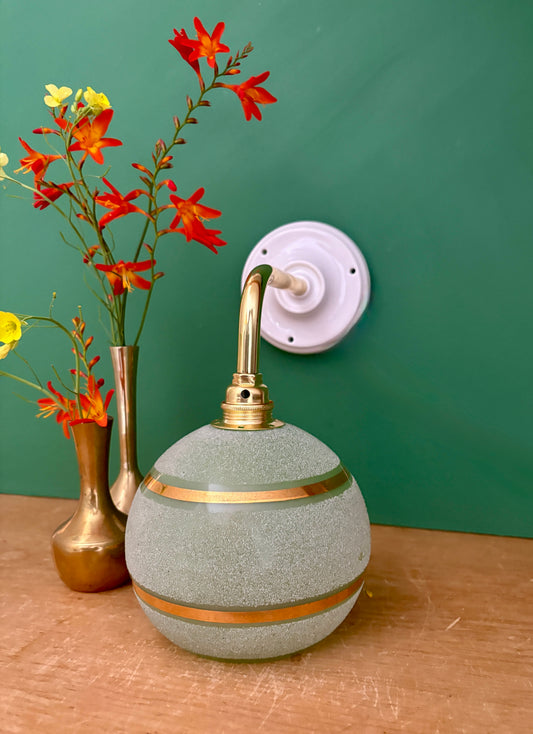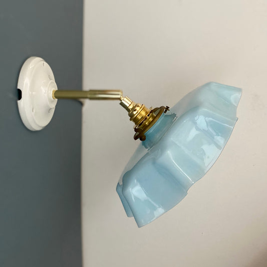 Applique coudée abat-jour vintage en verre de clichy blanc liserés rouges