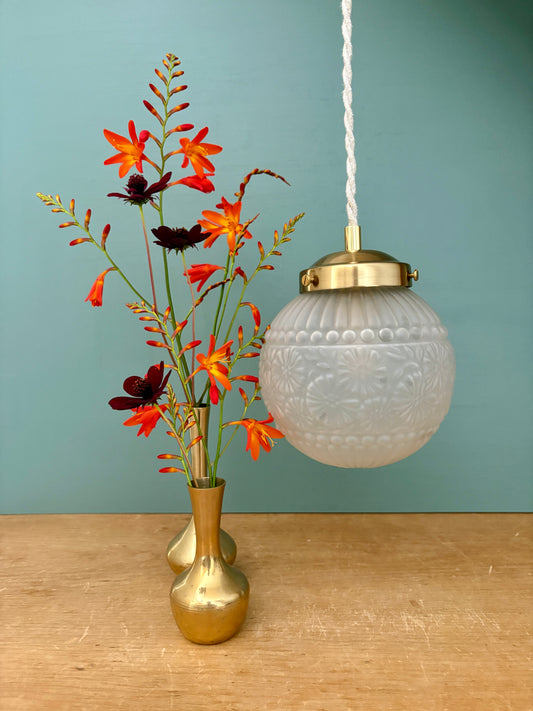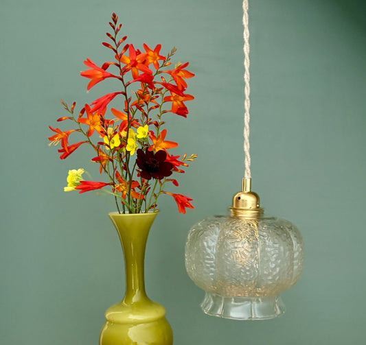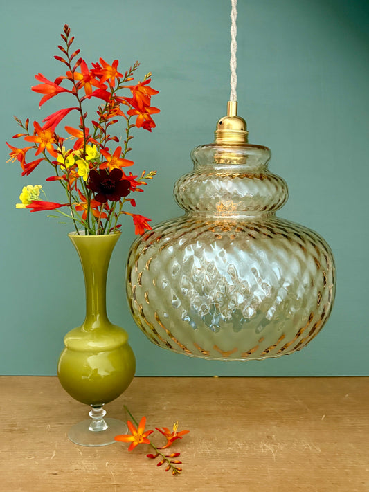 Suspension abat-jour vintage en verre de clichy blanc avec liserés rouge