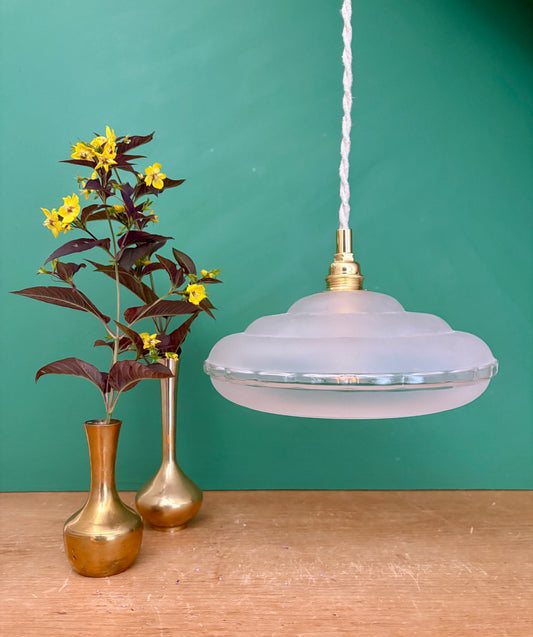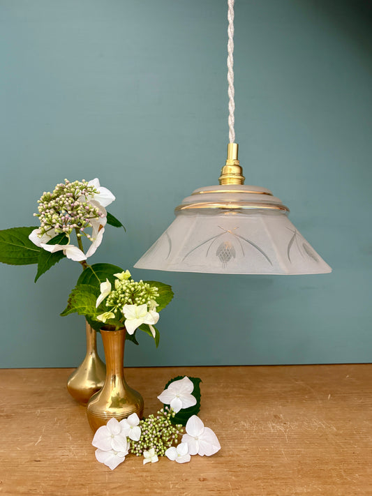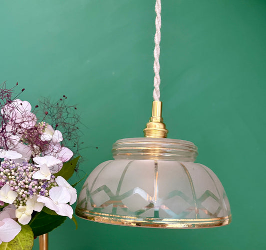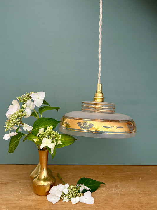 Suspension abat-jour vintage en verre dépoli avec frise dorée