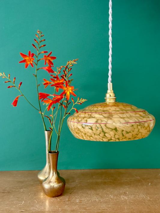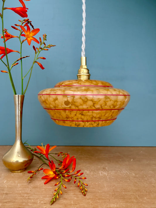 Suspension abat-jour vintage en verre de Clichy jaune avec liserés rouges