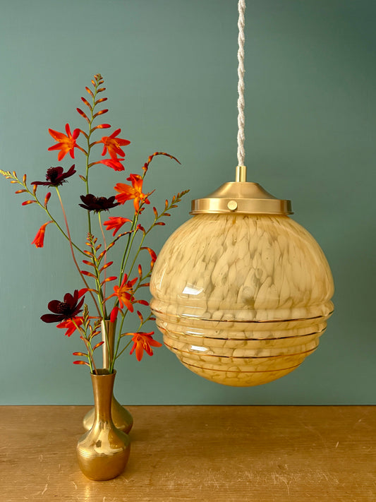 Suspension globe vintage art déco en verre de Clichy jaune et doré