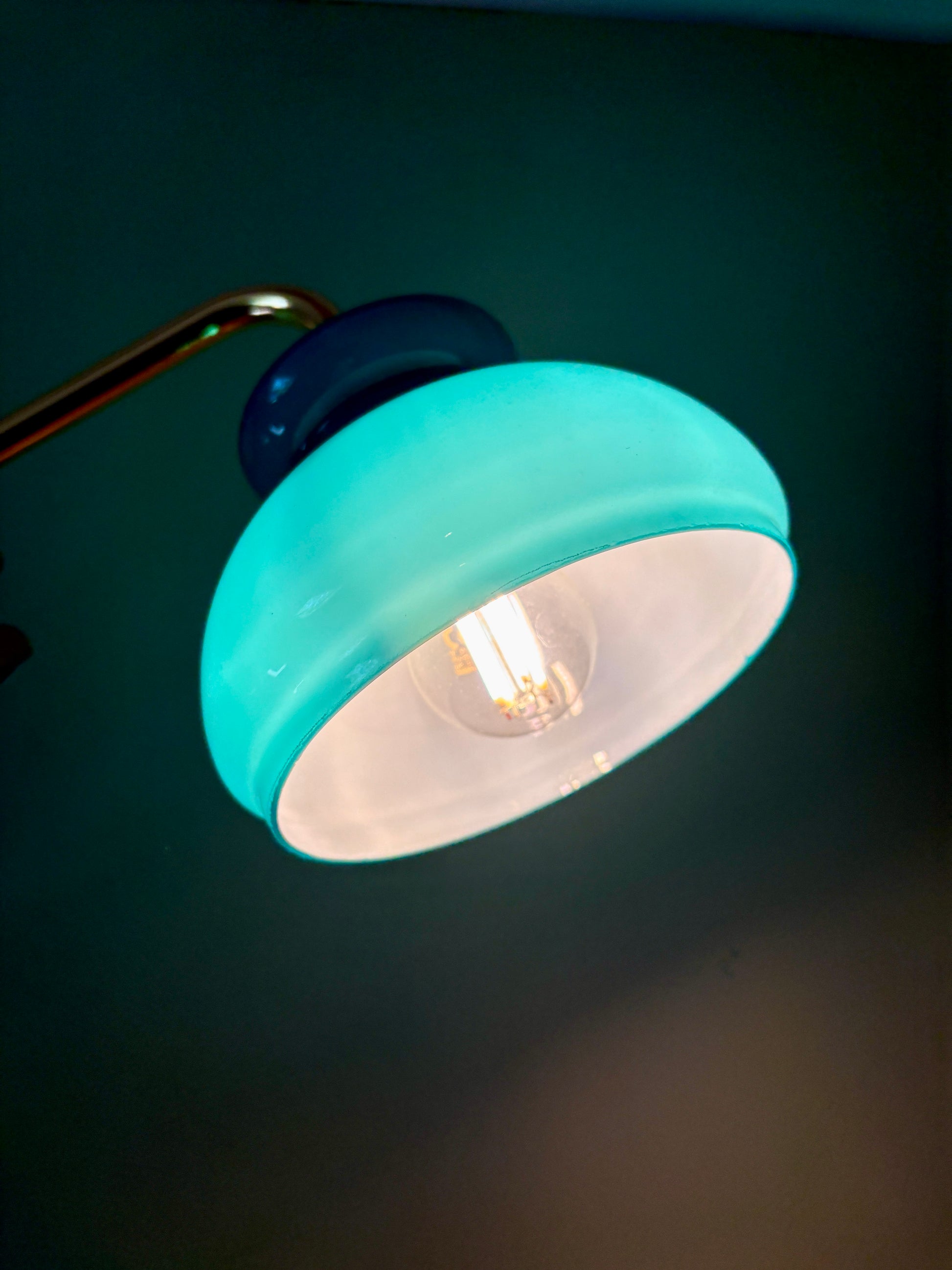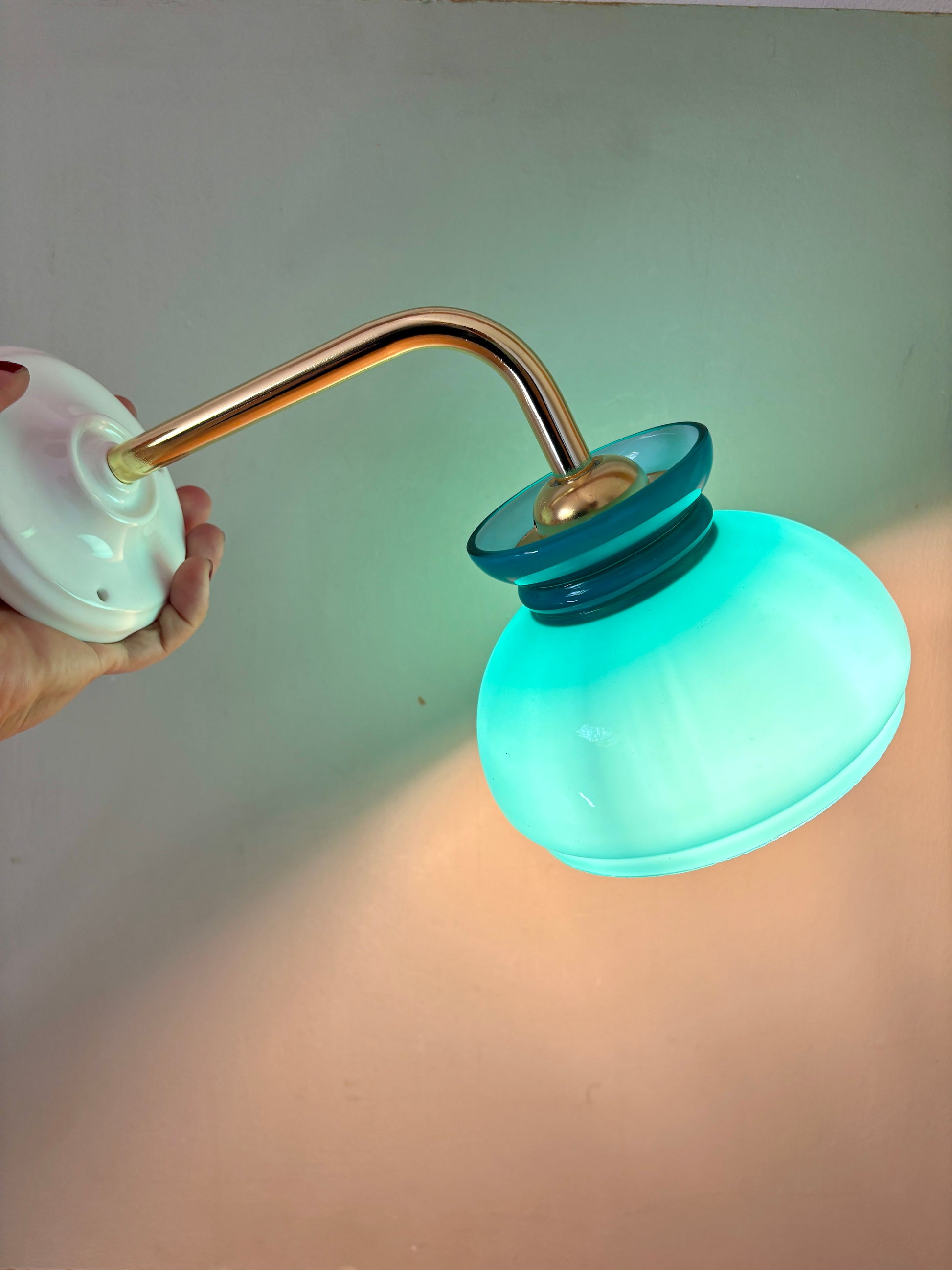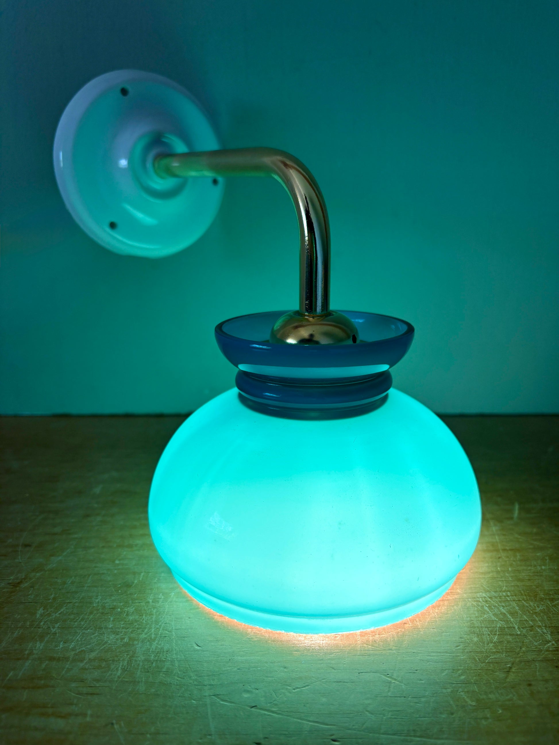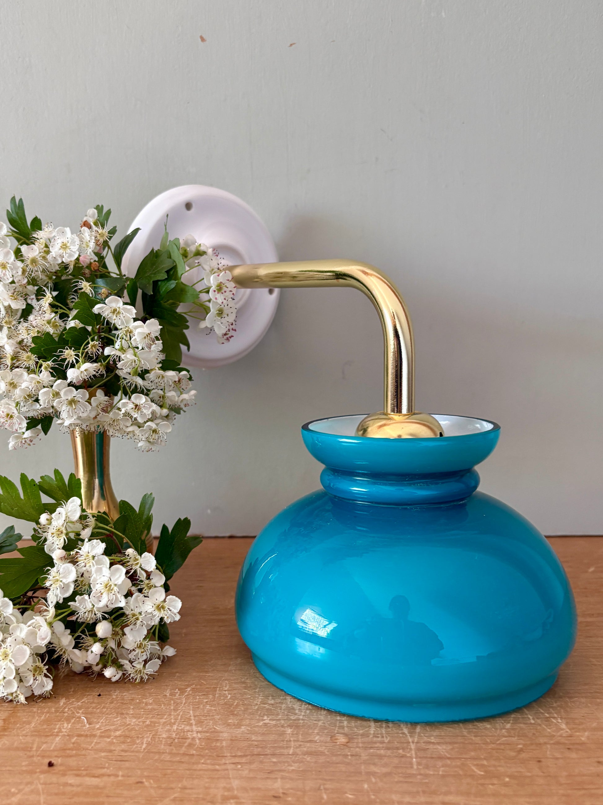 Jolie applique composée d'un socle neuf et d'un globe en opaline bleue.