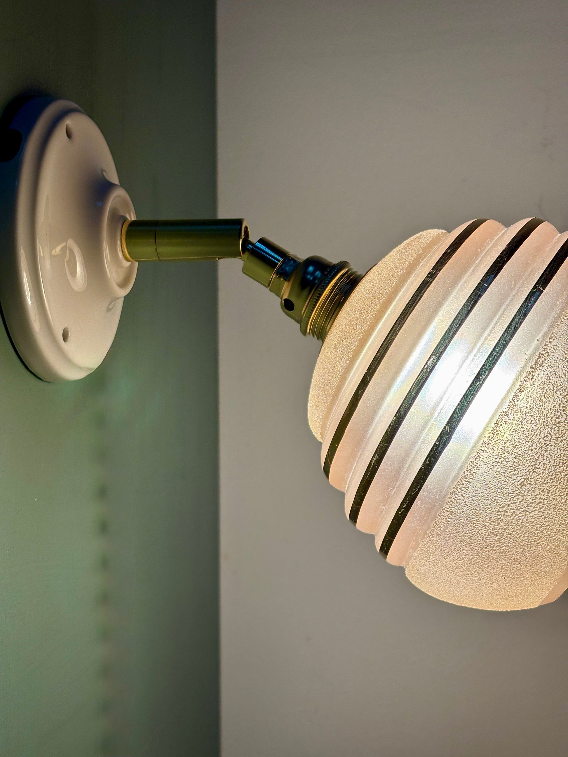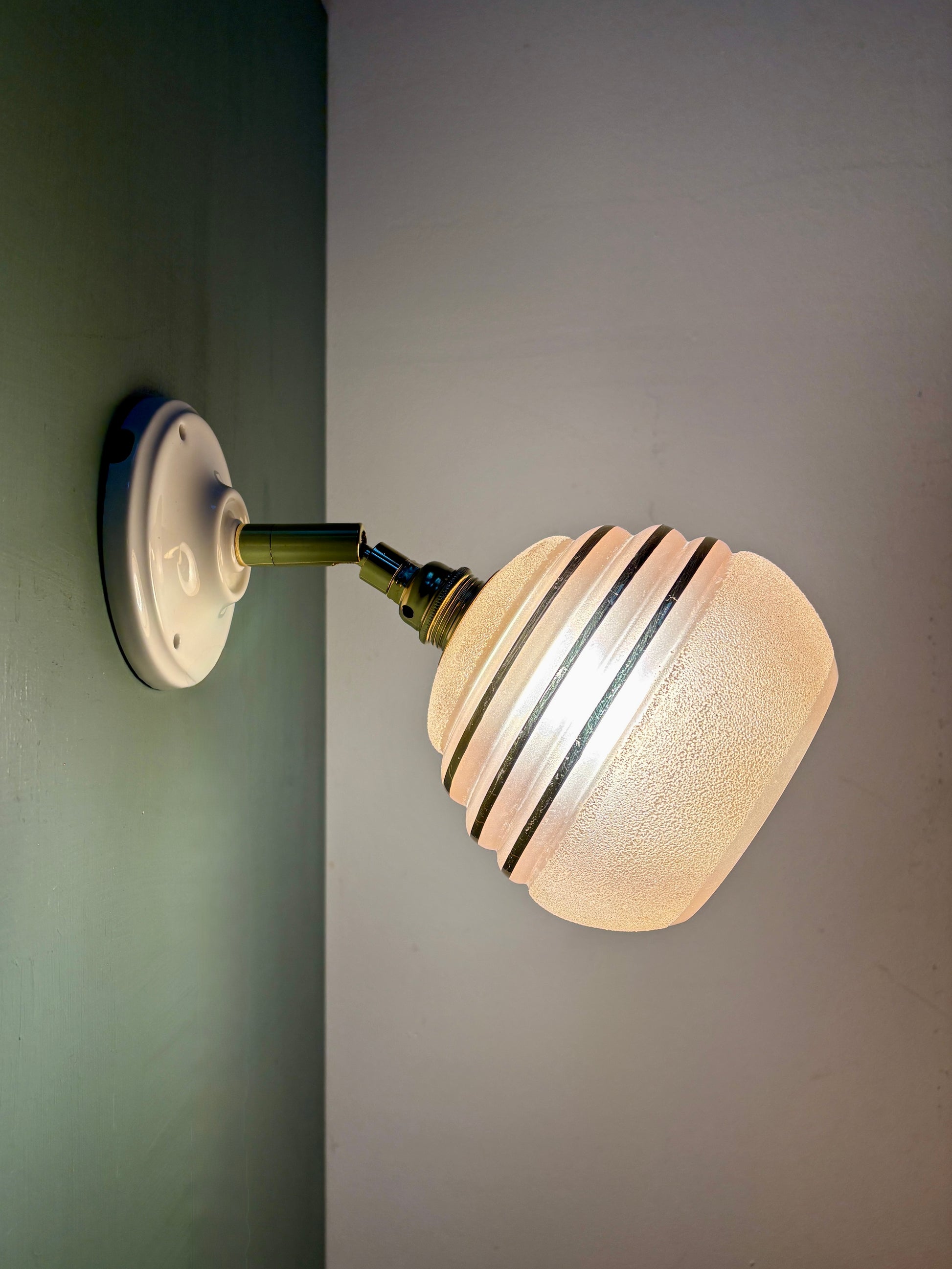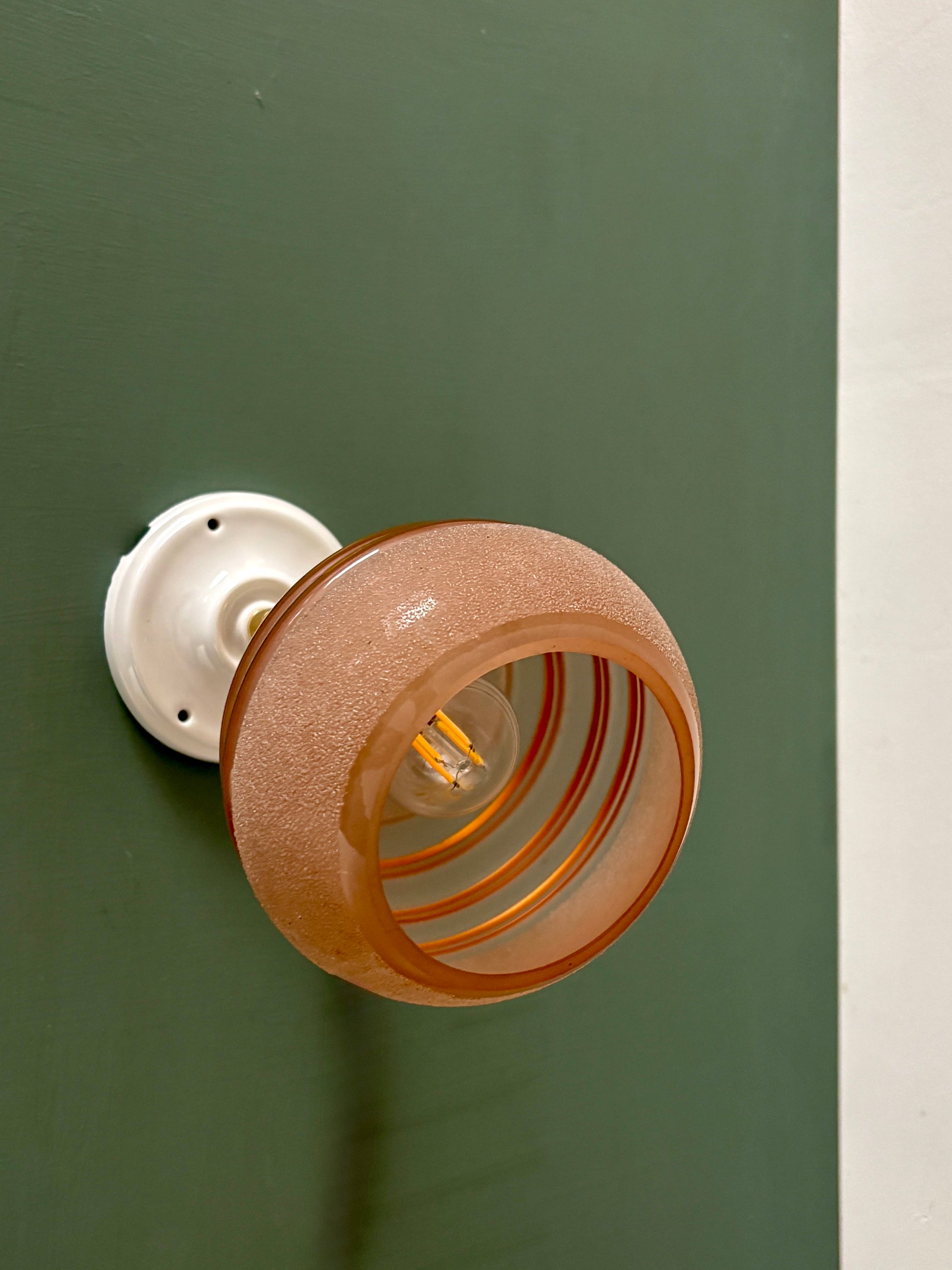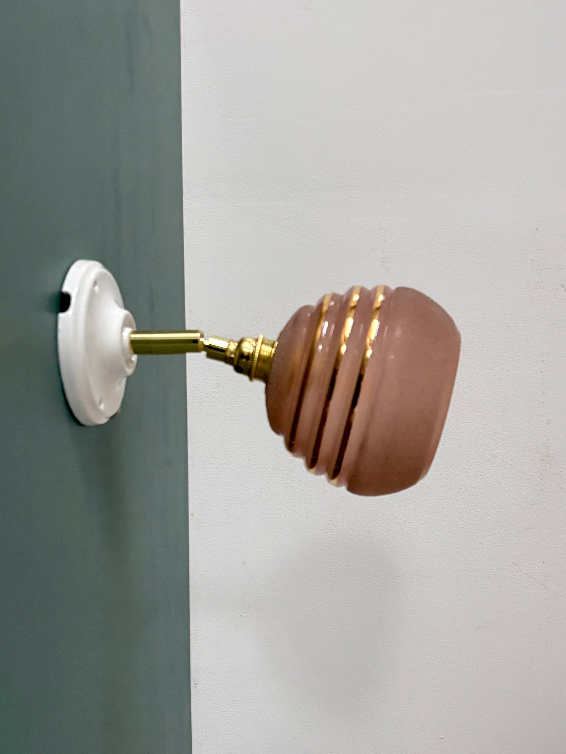 Très belle applique avec tulipe vintage en verre granité rose avec liserés dorés.