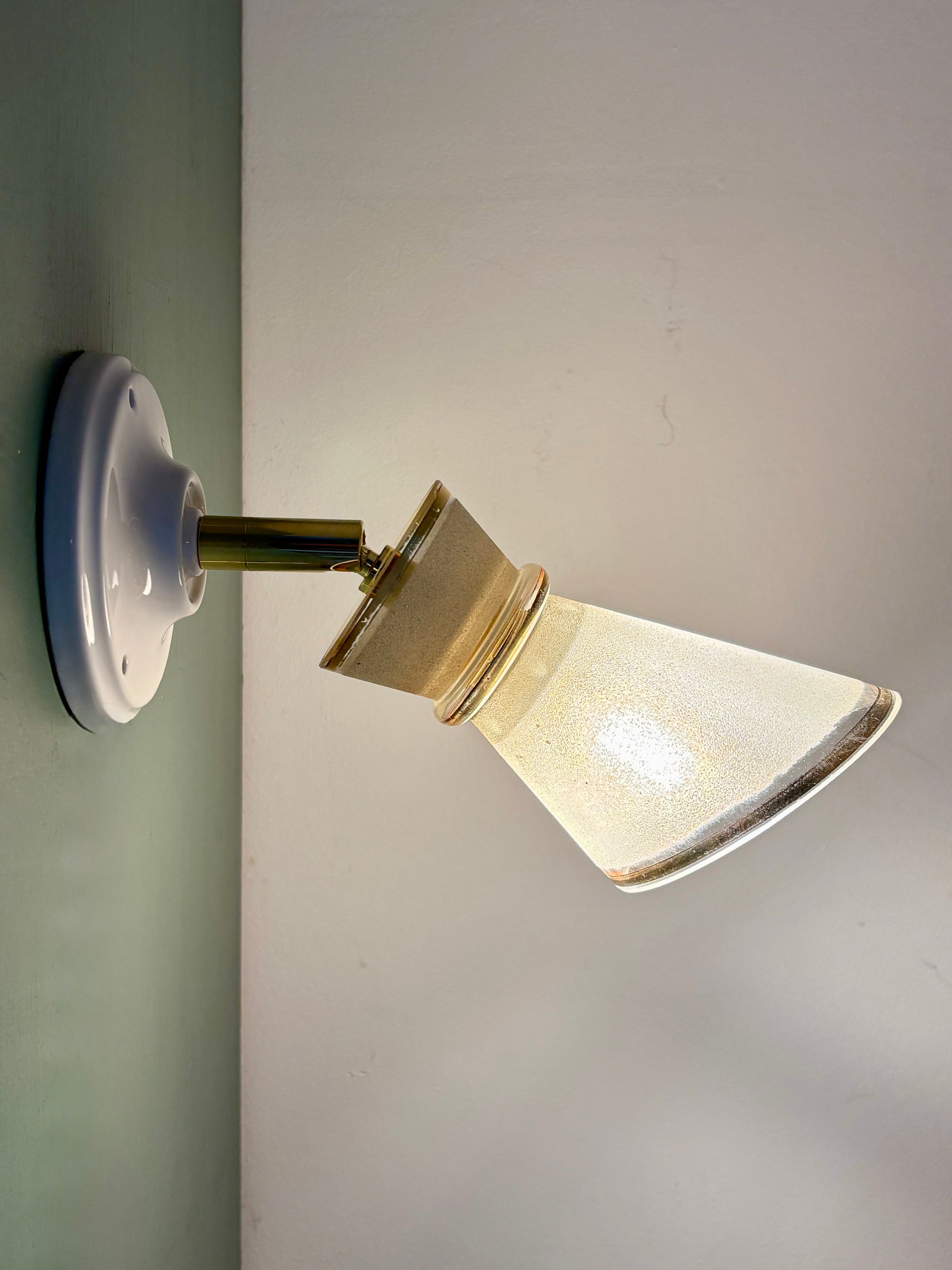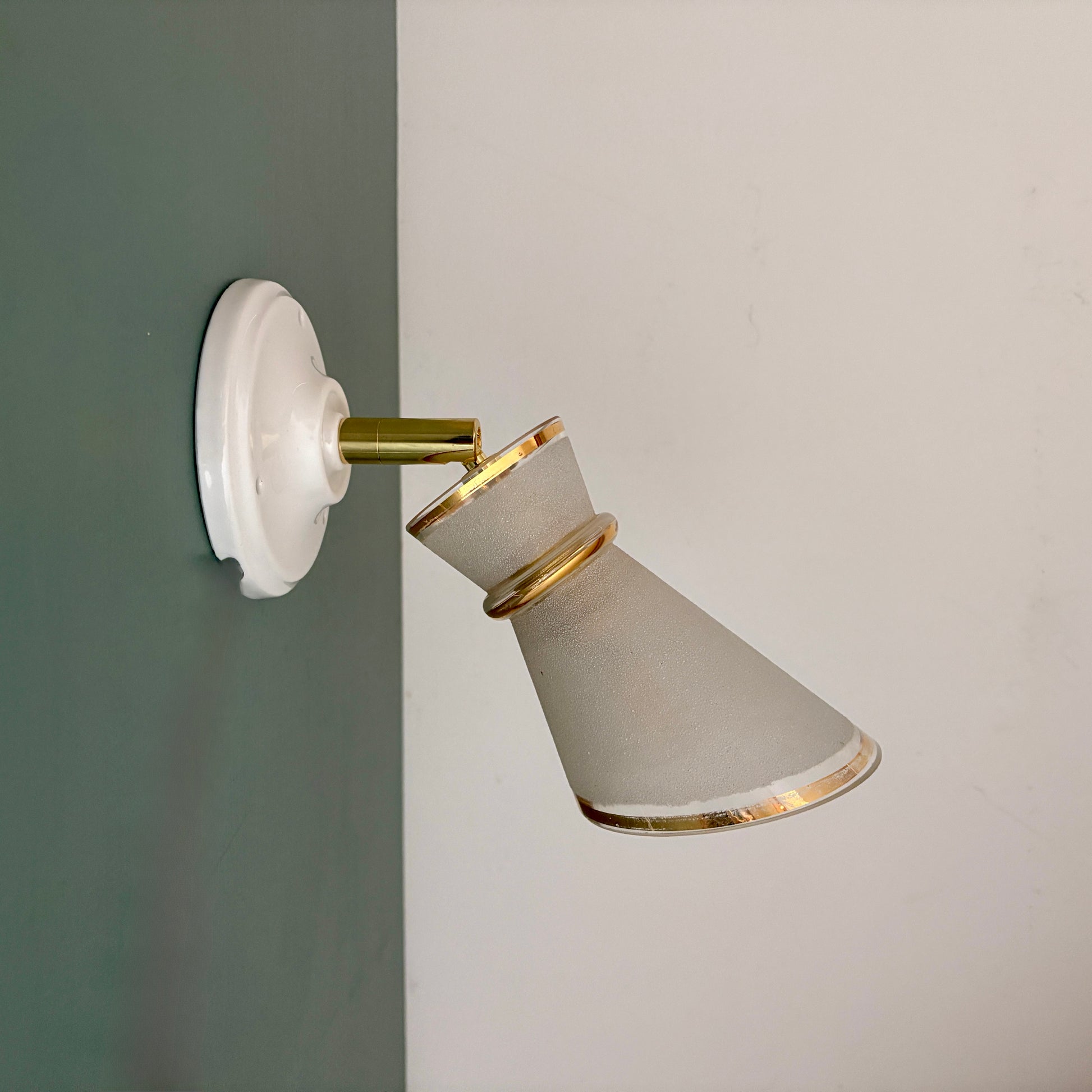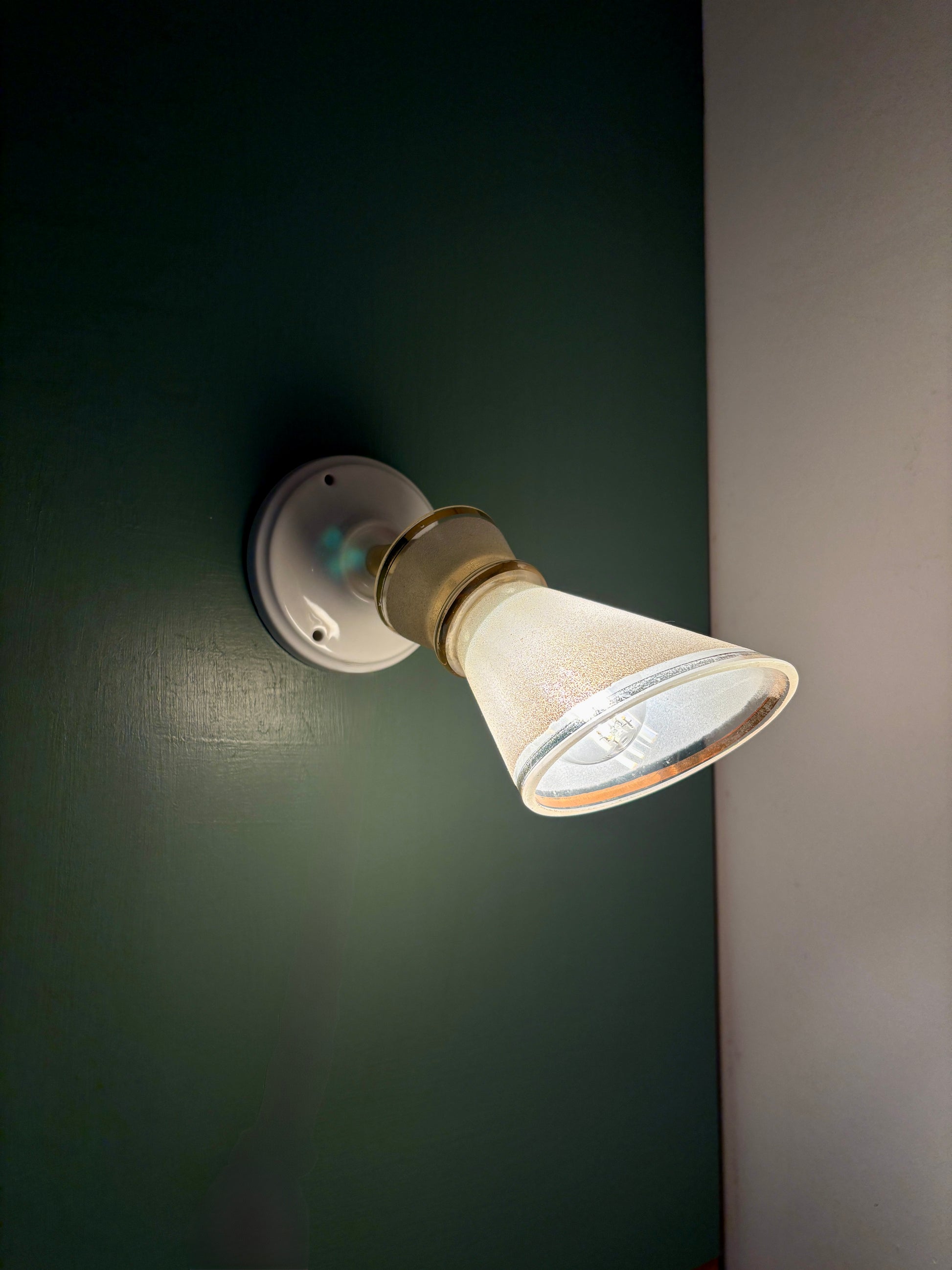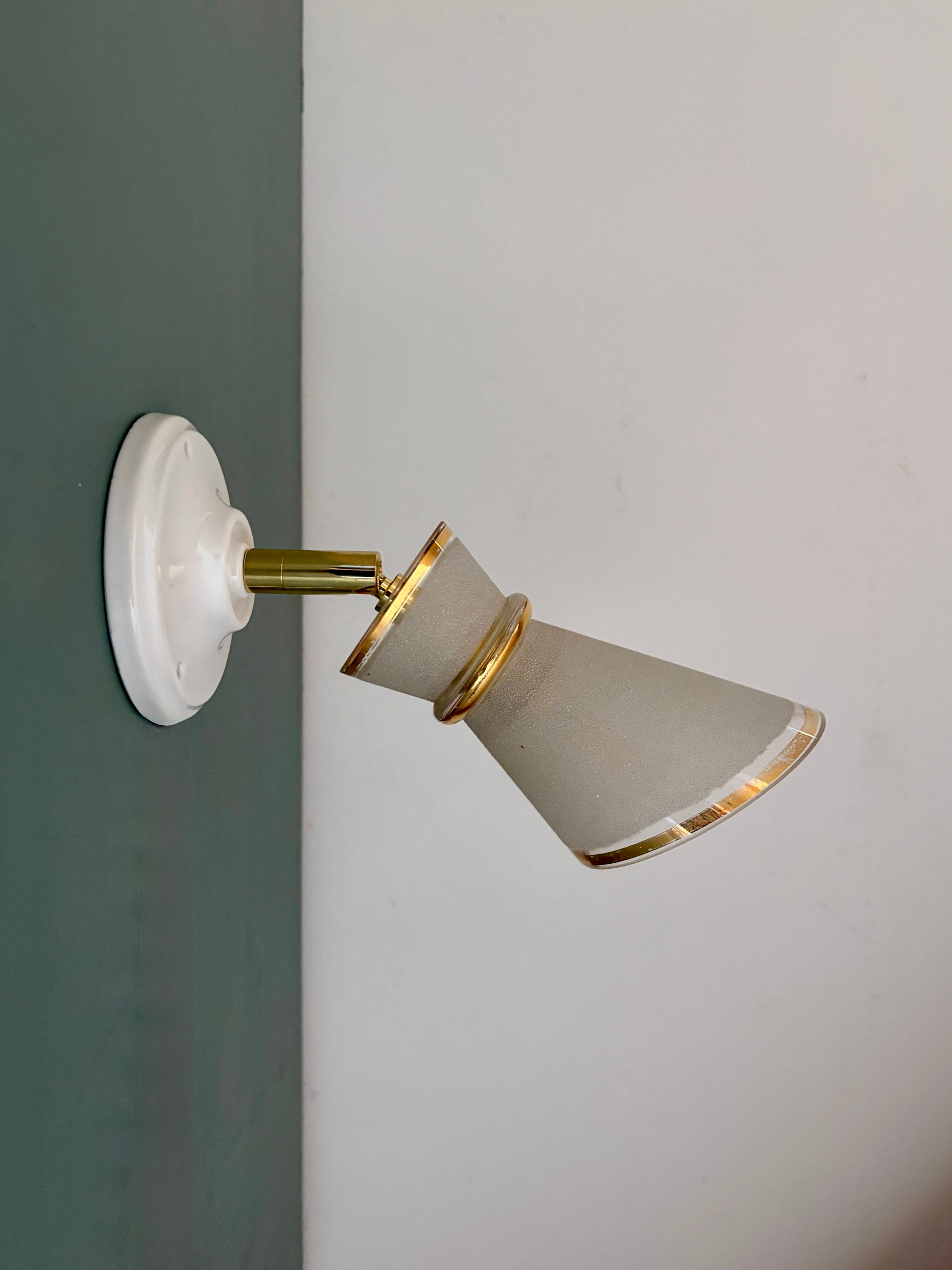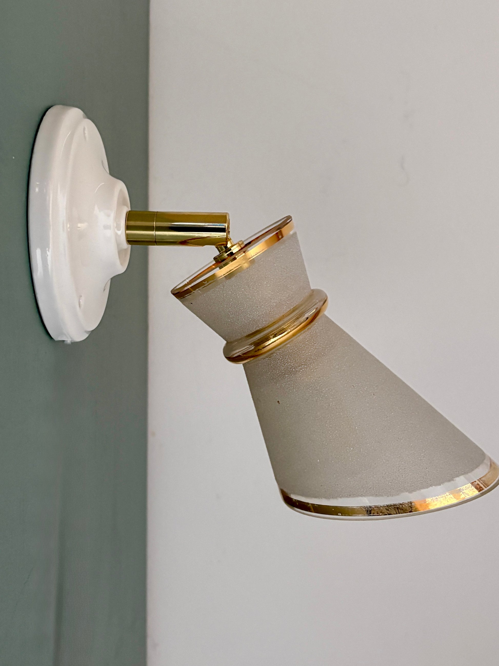 Belle applique avec tulipe vintage en verre granité blanc et doré.