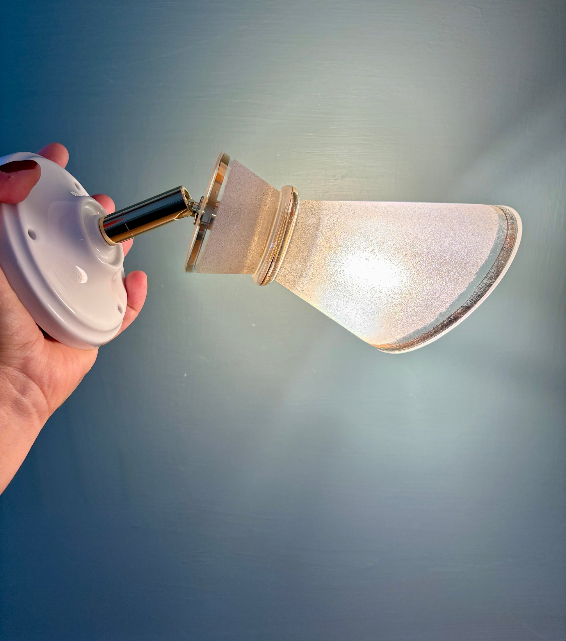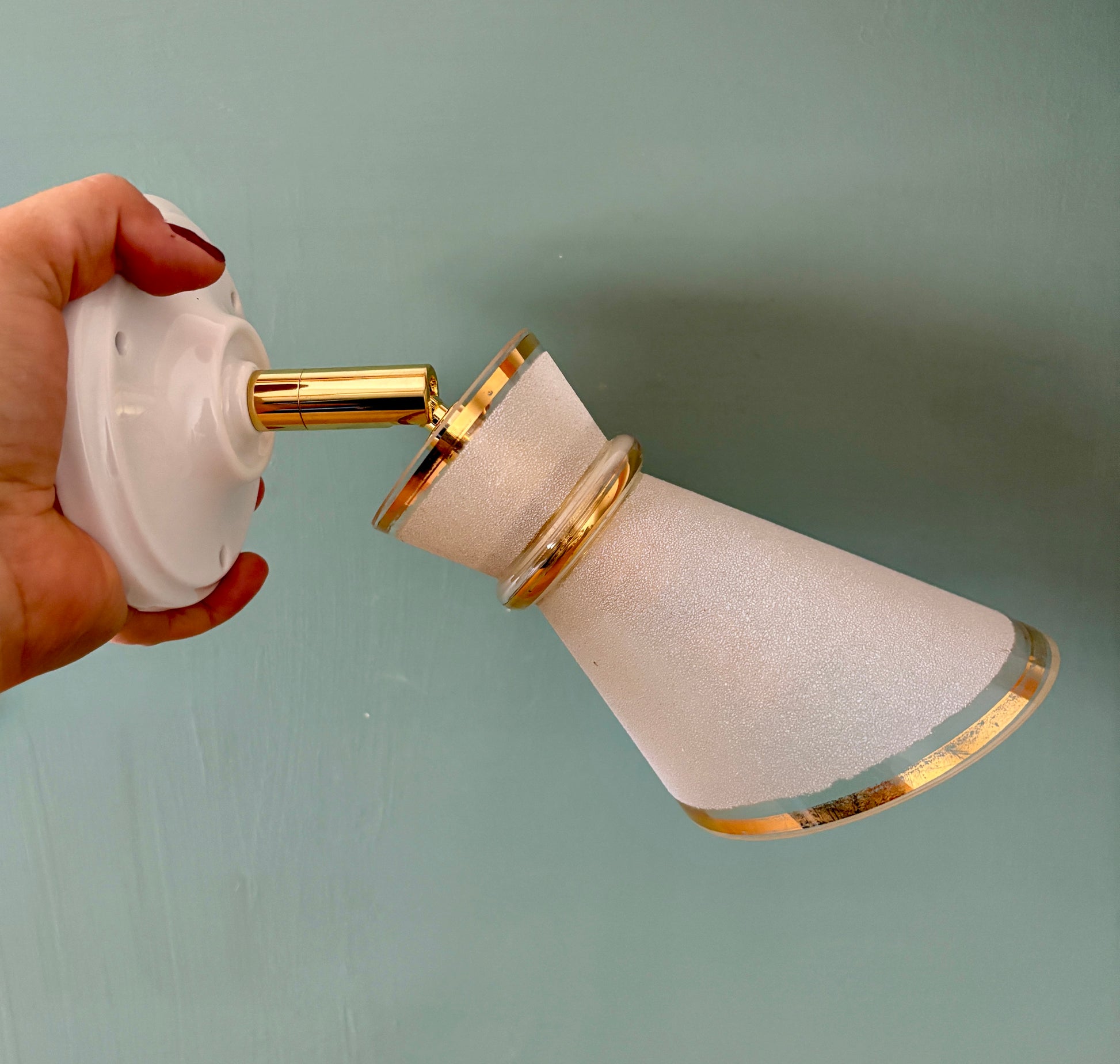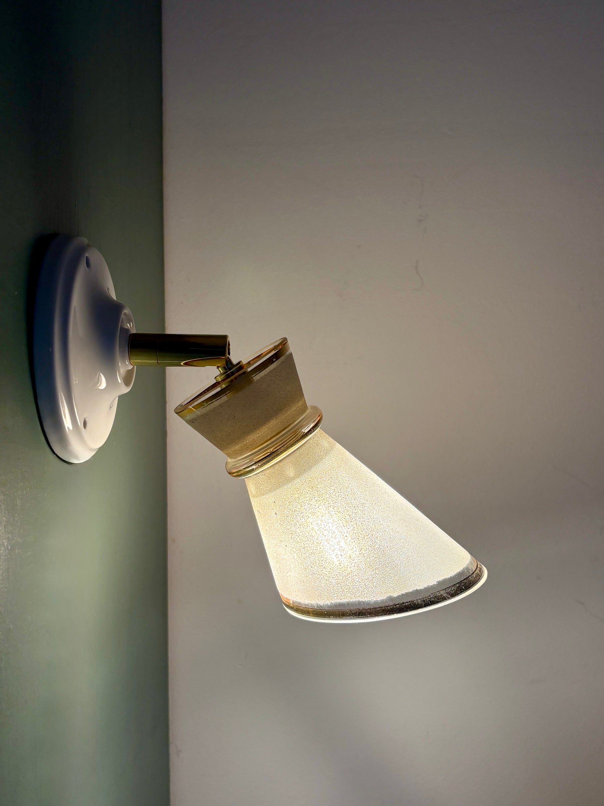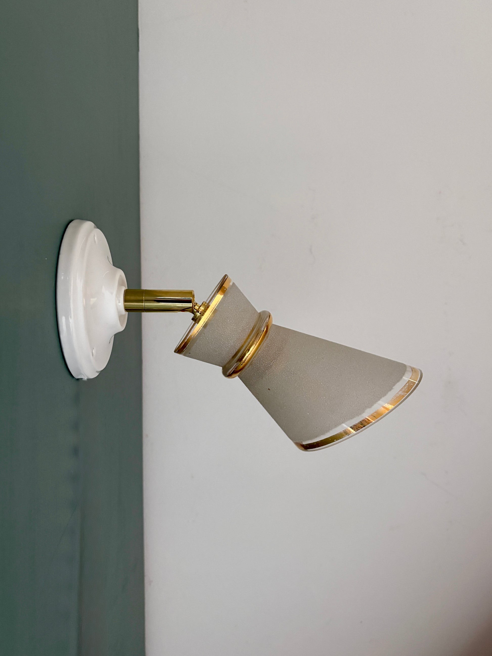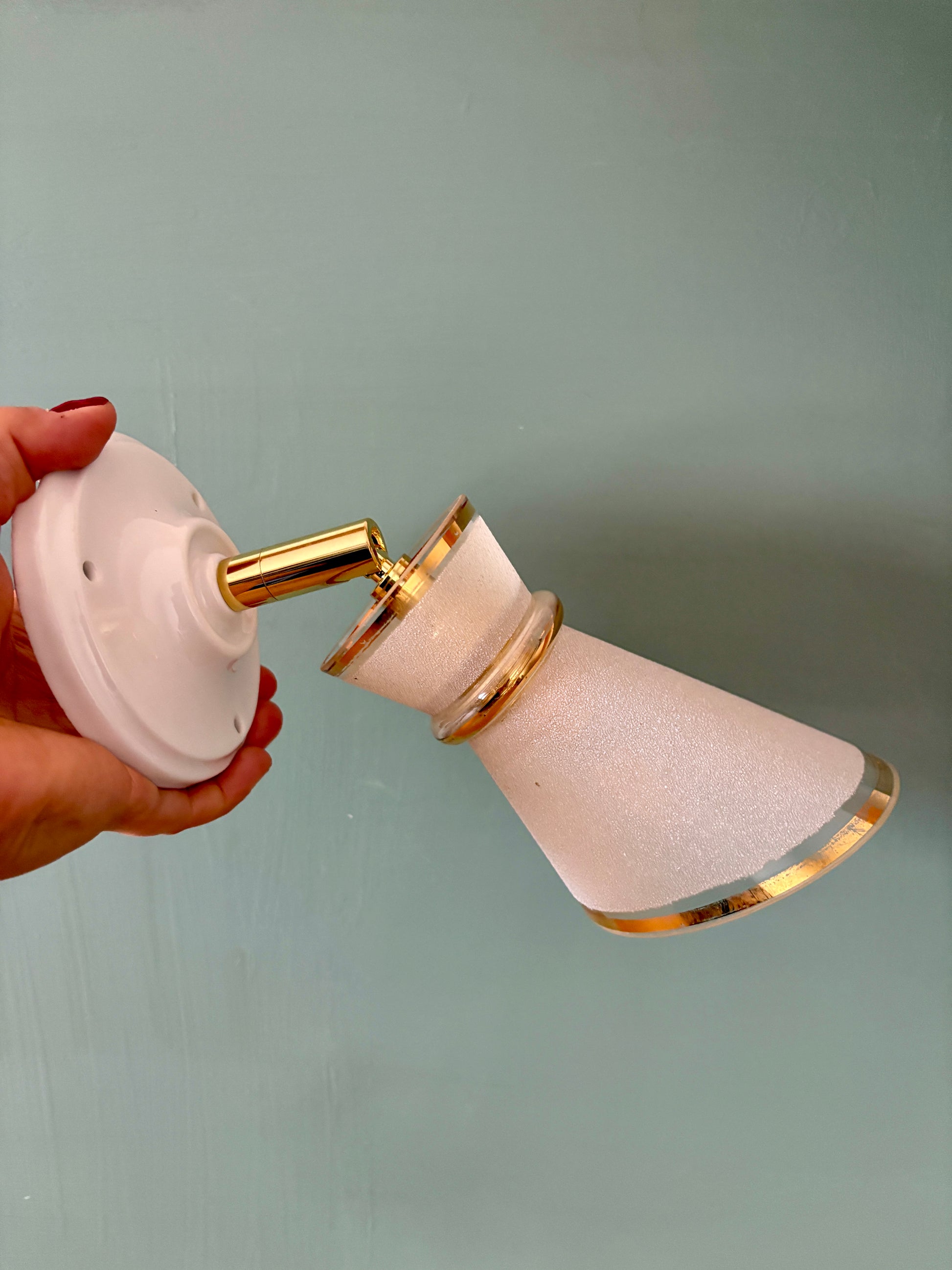 Belle applique avec tulipe vintage en verre granité blanc et doré.