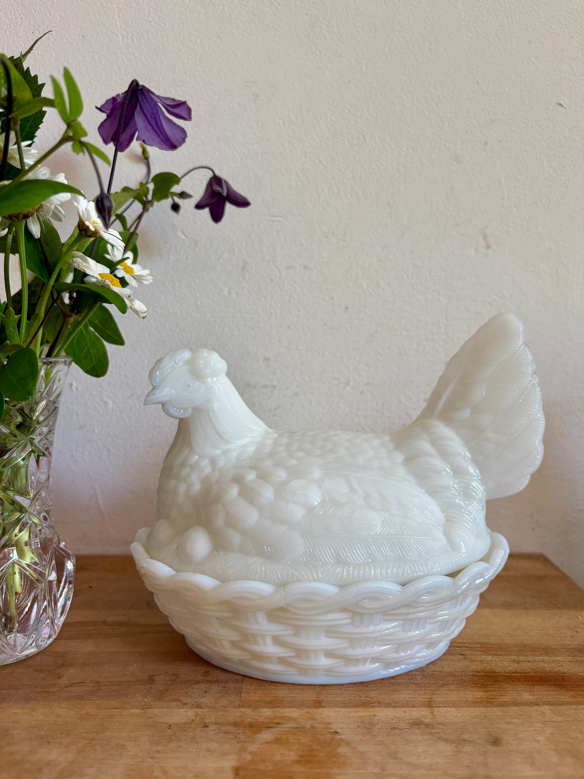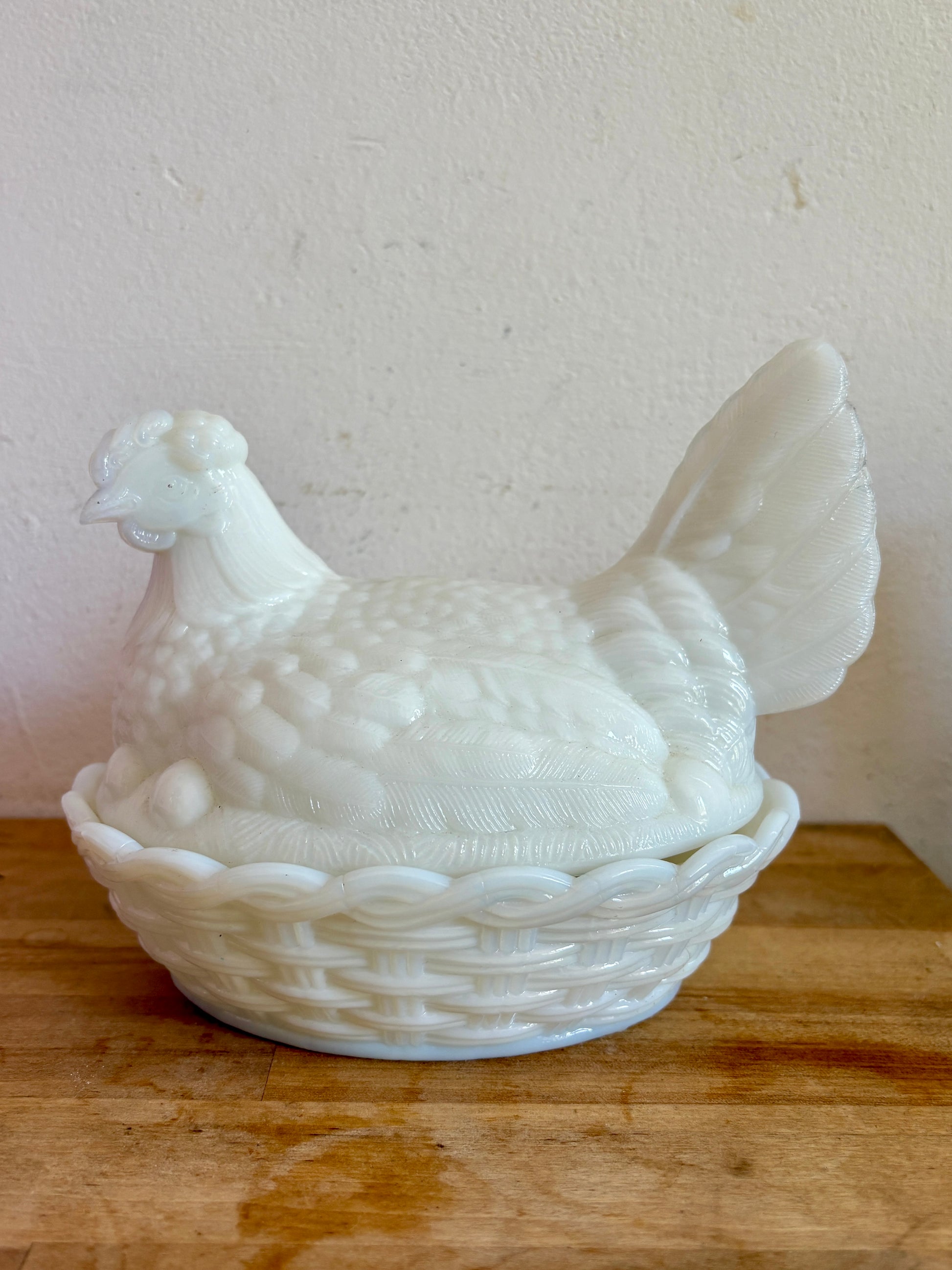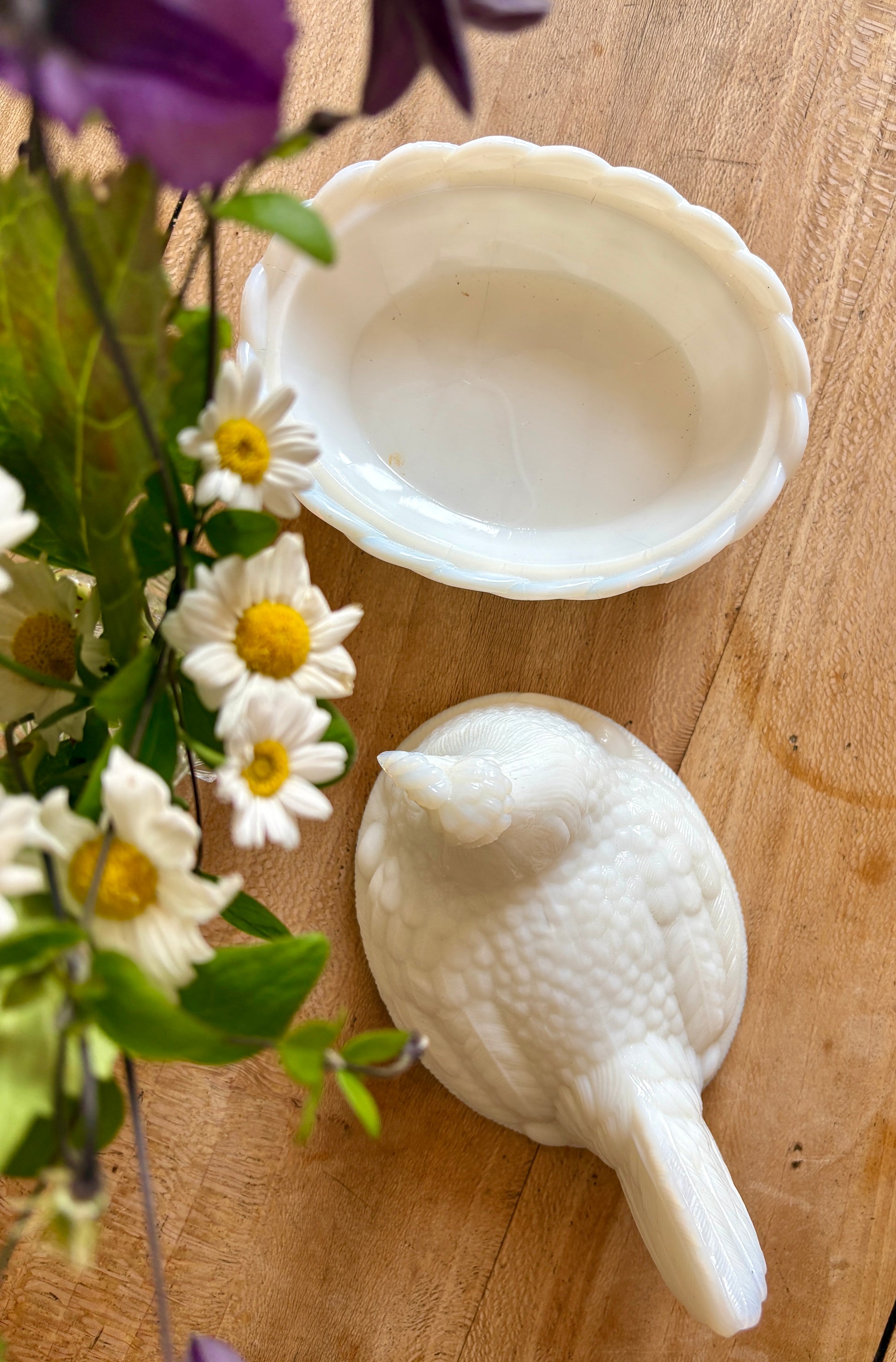 Jolie boîte vintage en opaline blanche. En forme de poule.