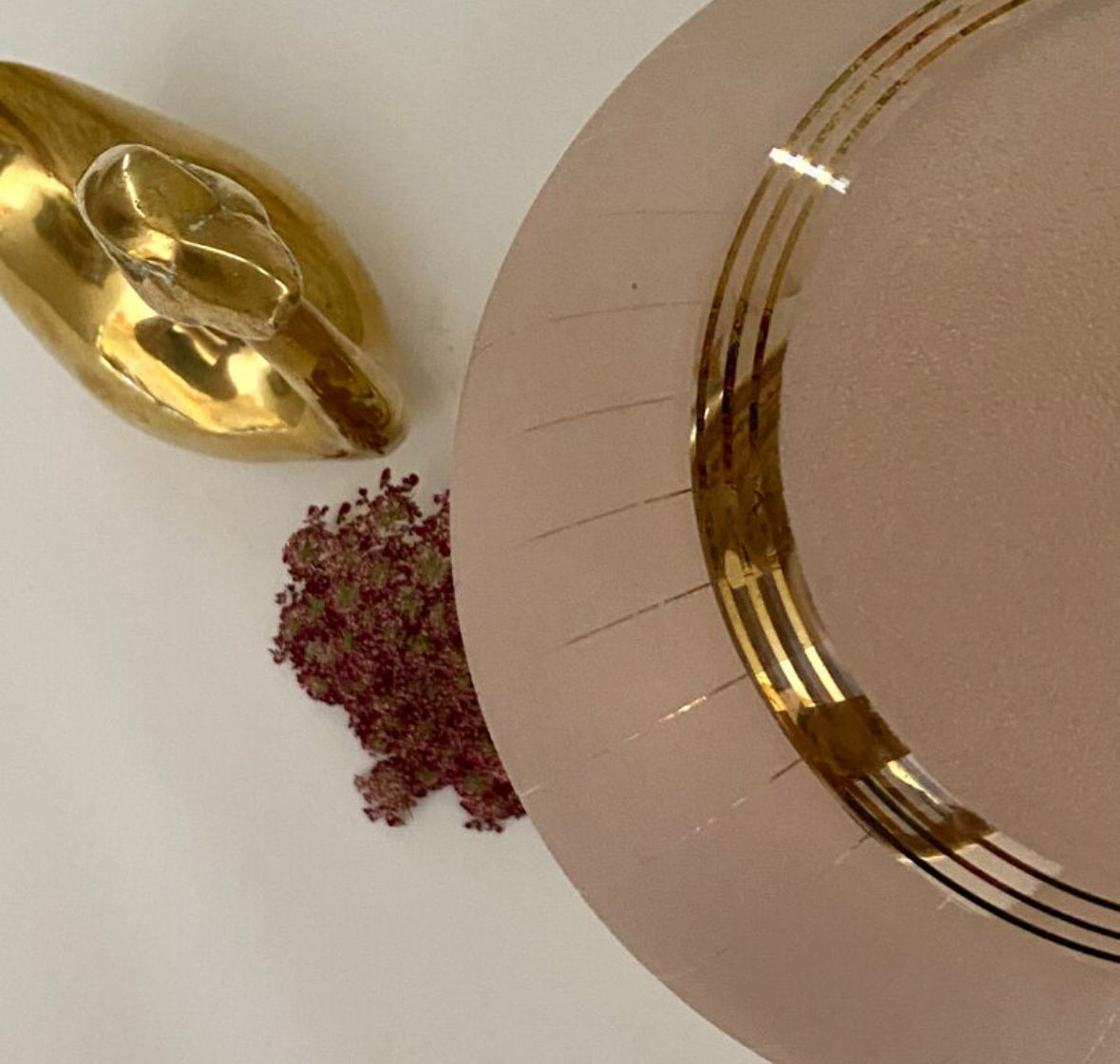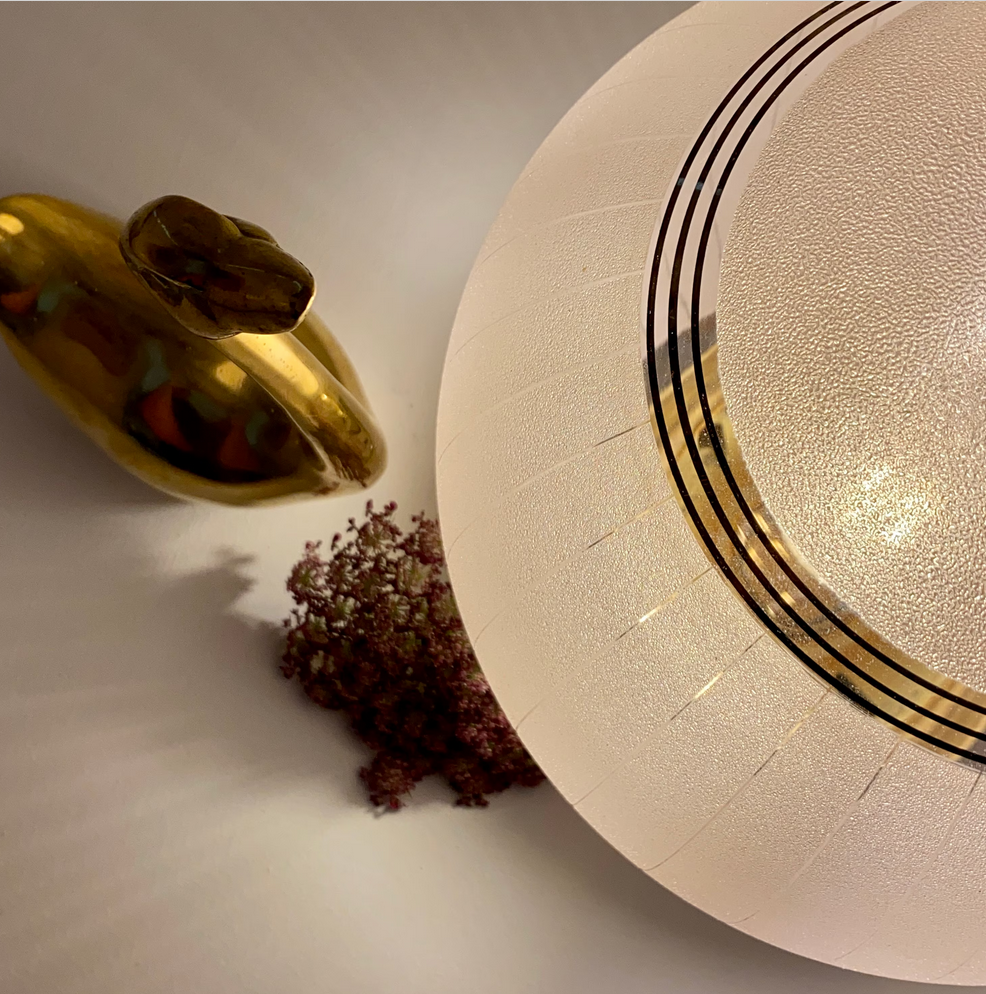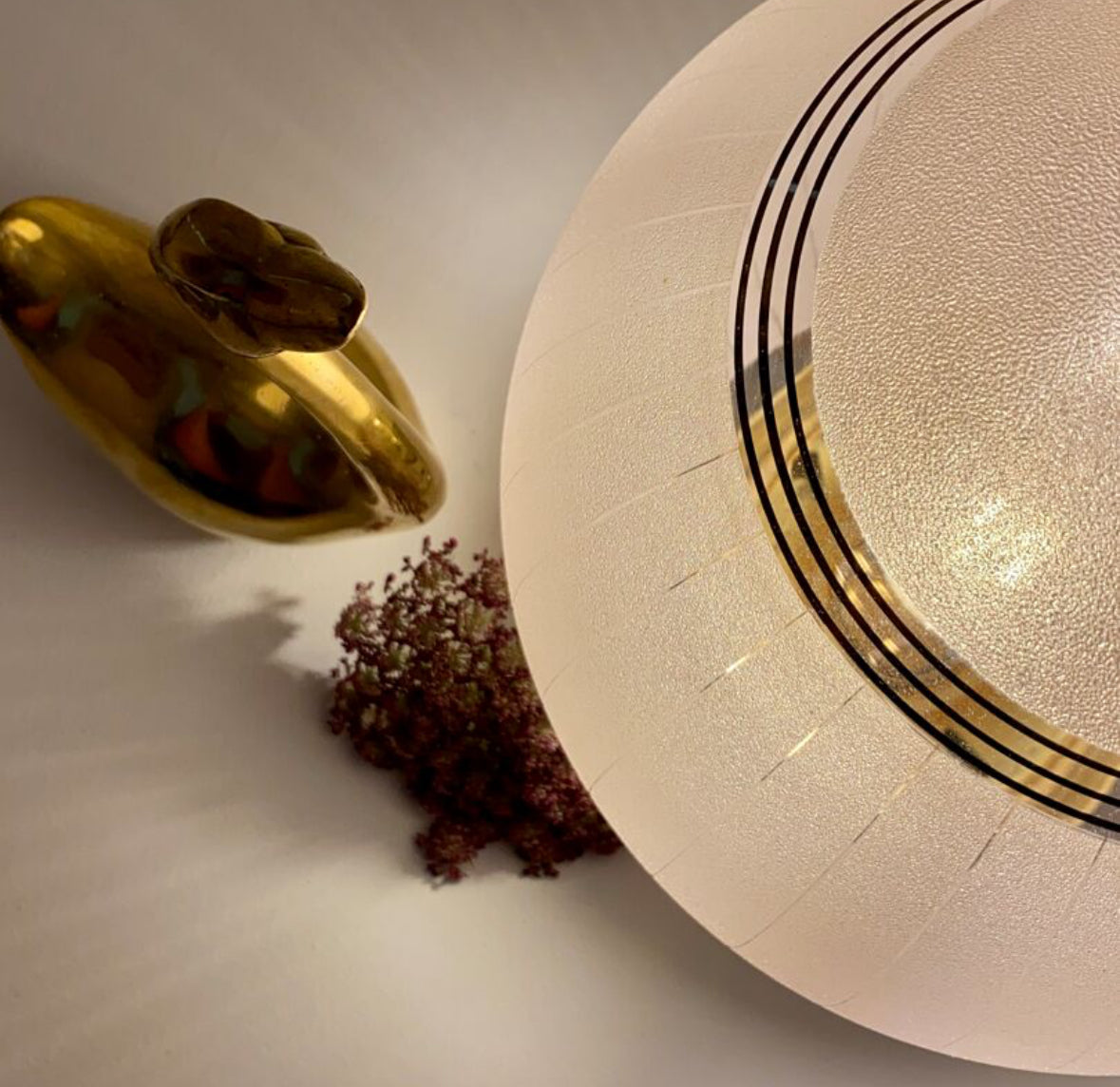 Jolie lampe à poser avec globe vintage art déco en verre sablé rose avec des liserés dorés.