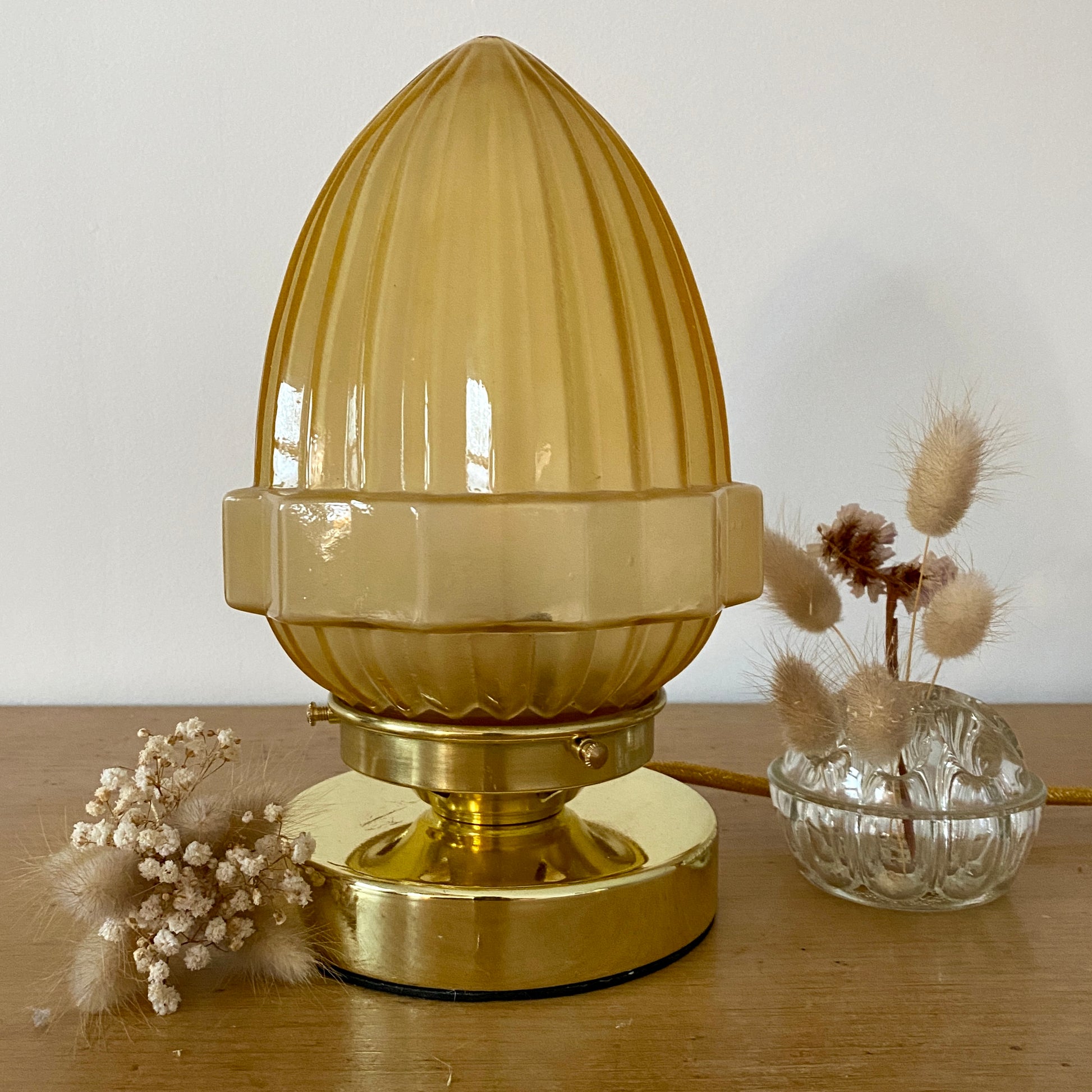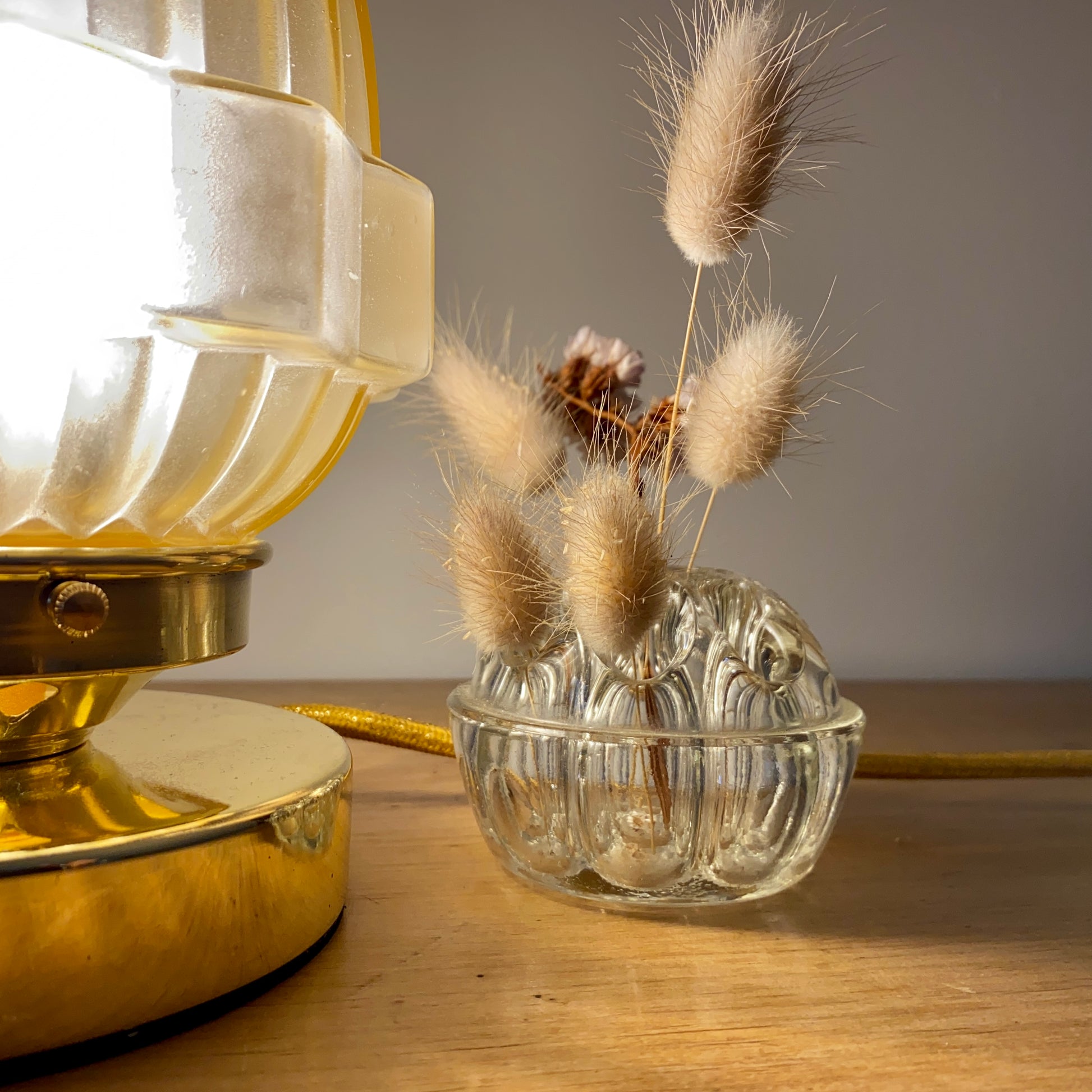 Belle lampe à poser composée d'un globe vintage en verre jaune et d'un socle en laiton et métal doré.