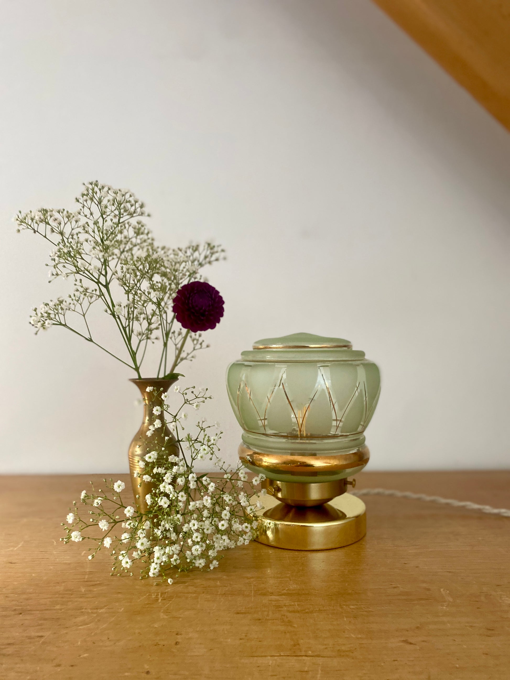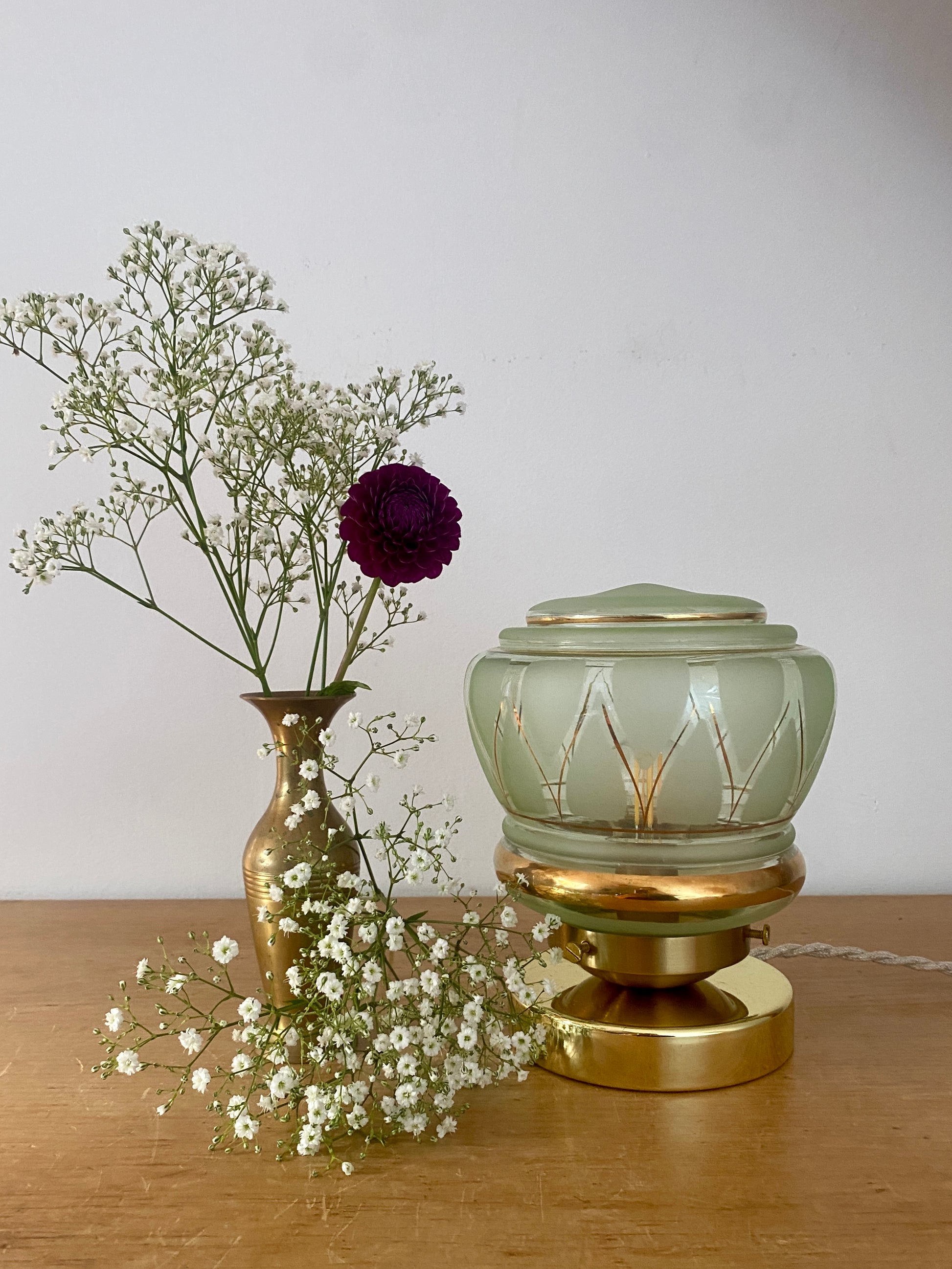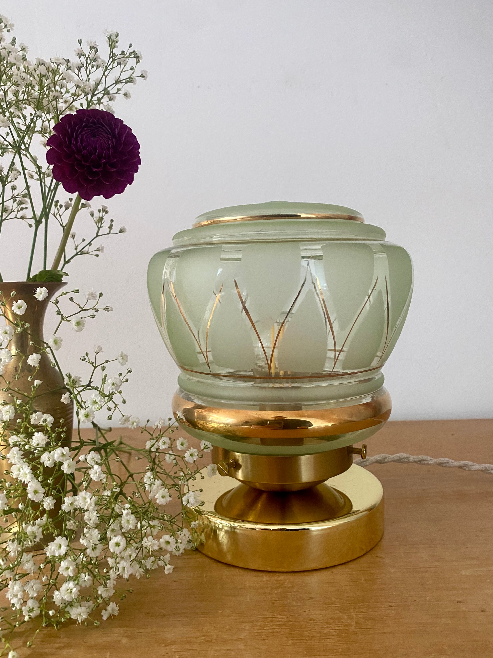 Très belle lampe à poser composée d'un globe vintage art déco en verre dépoli vert mint et liserés dorés et d'un socle en laiton et métal doré.