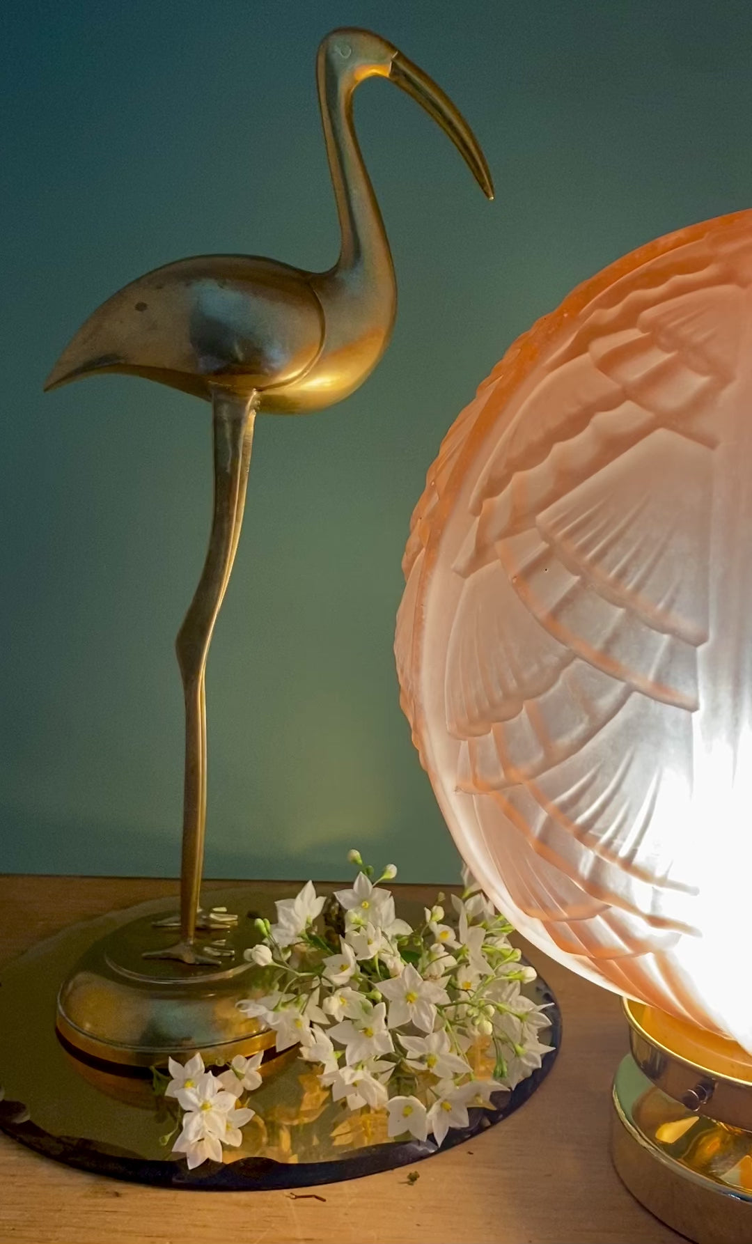 Magnifique lampe à poser composée d'un globe vintage art déco d'un socle en laiton et métal doré.
