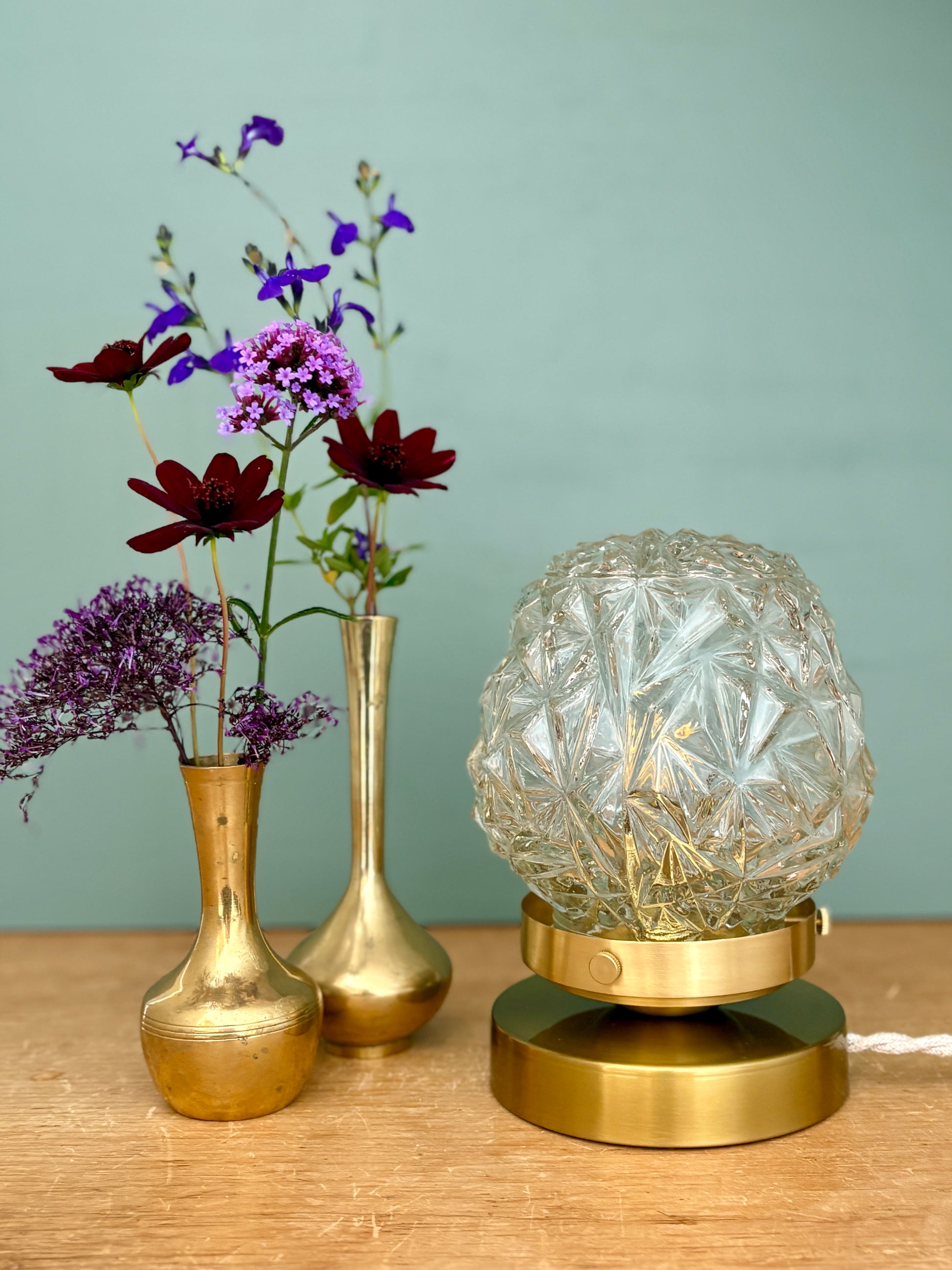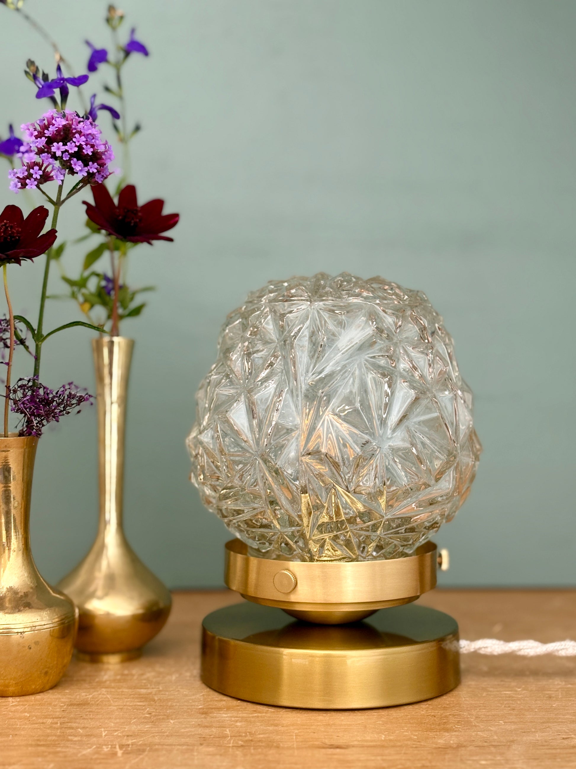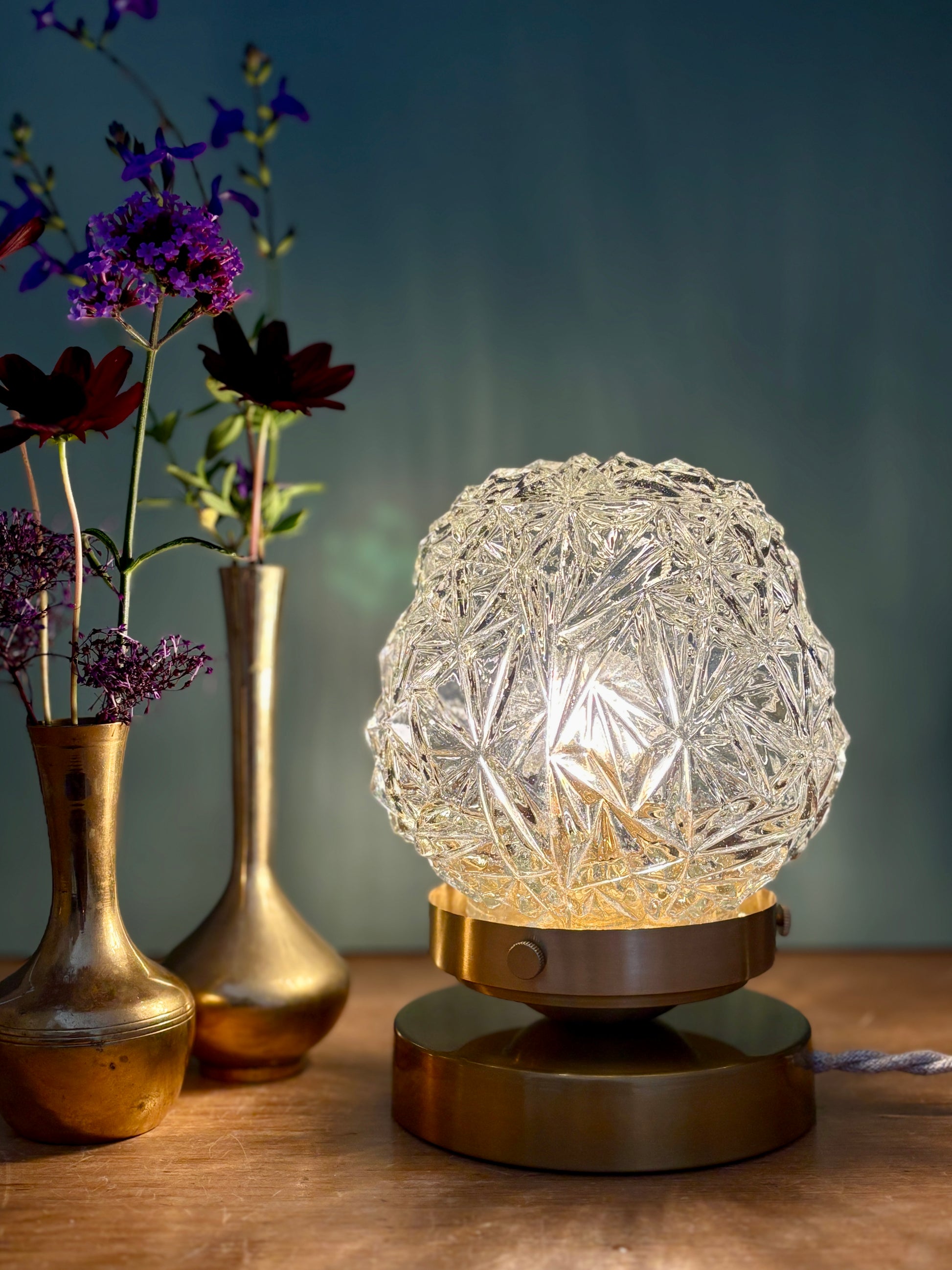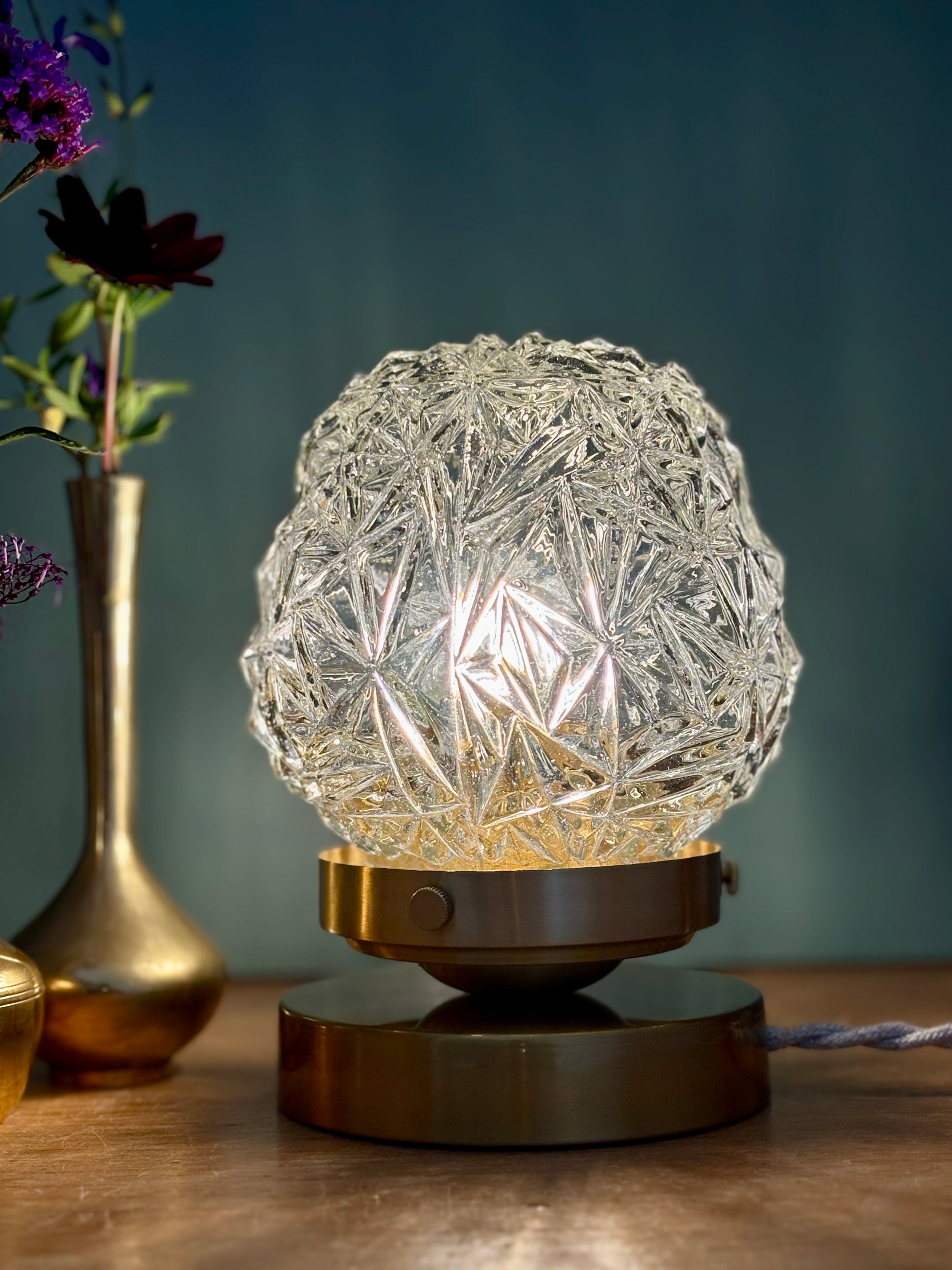 Belle lampe à poser composée d'un globe vintage en verre moulé et d'un socle en métal bronze.