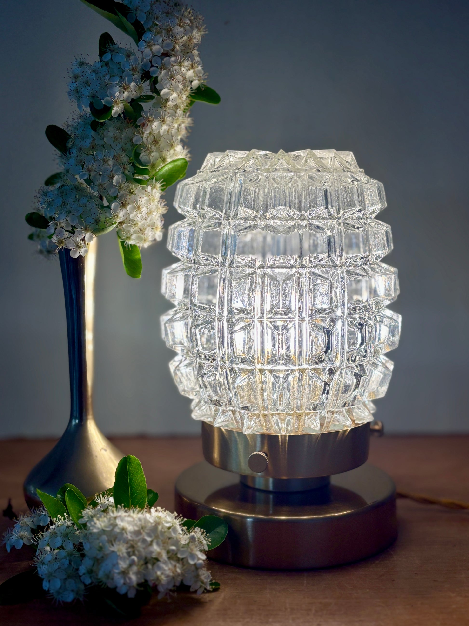 Belle lampe à poser composée d'un globe vintage en verre et d'un socle en laiton et métal doré.