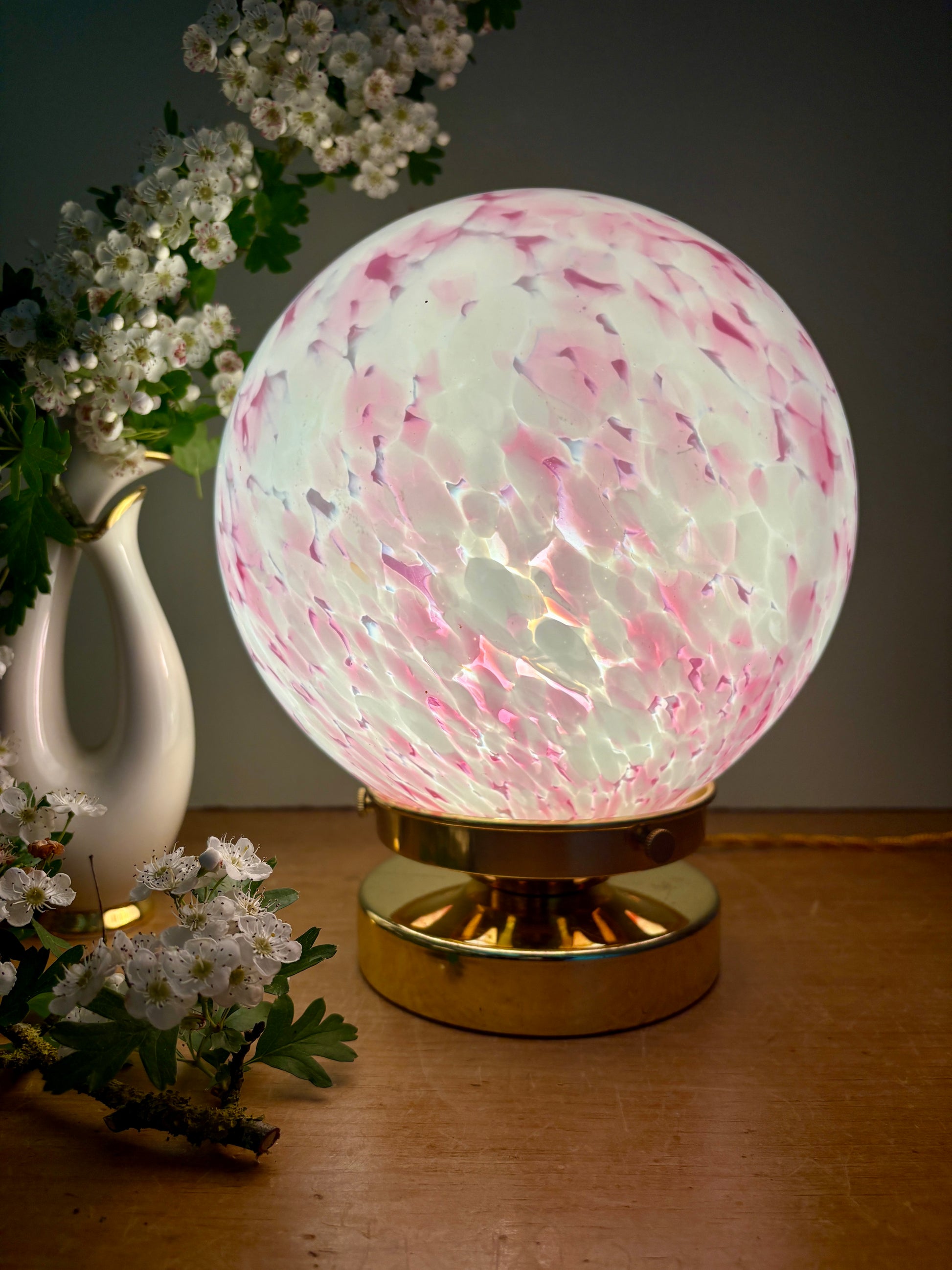 Belle lampe à poser, globe vintage art déco en verre de Clichy rose et blanc.