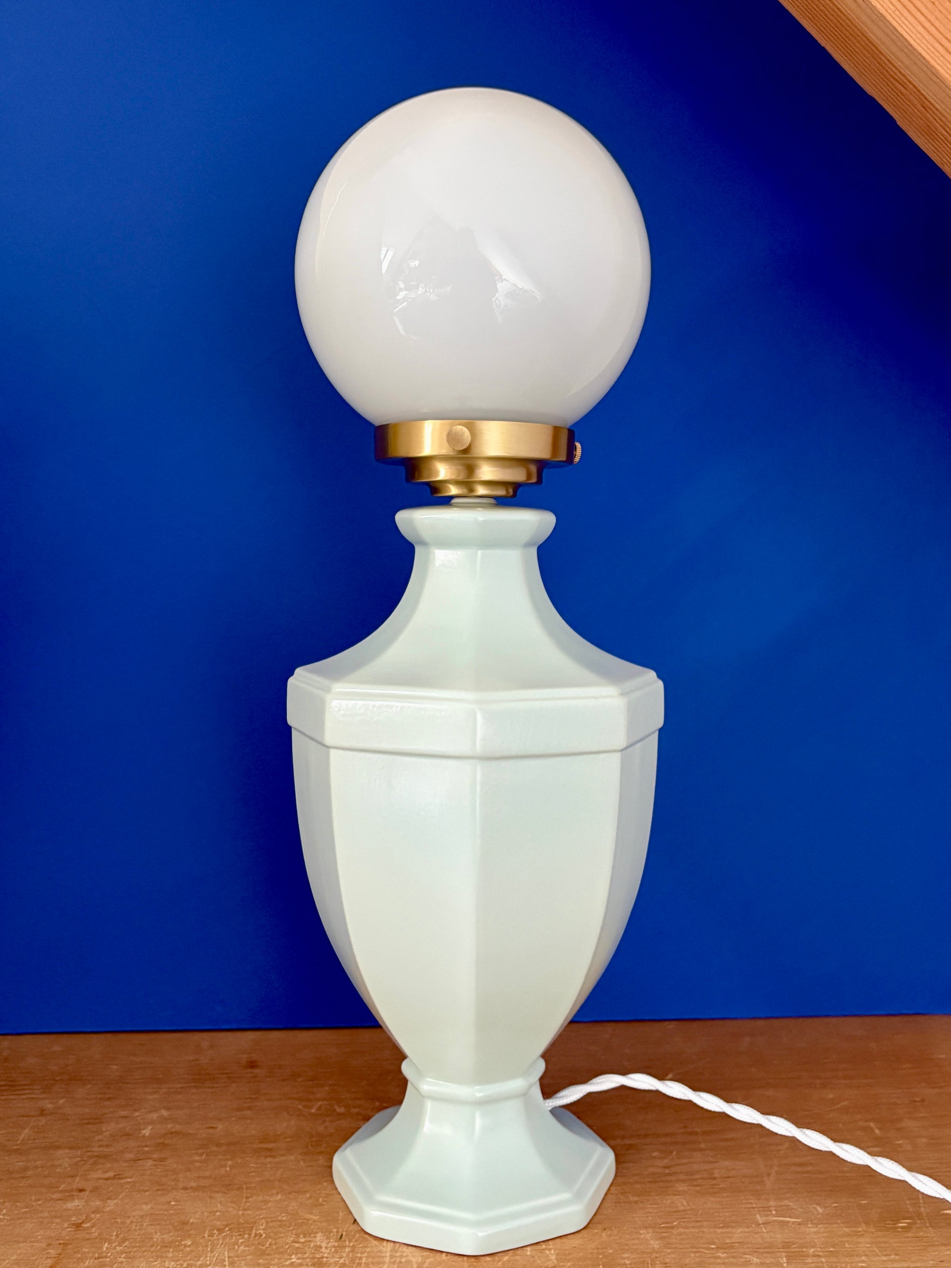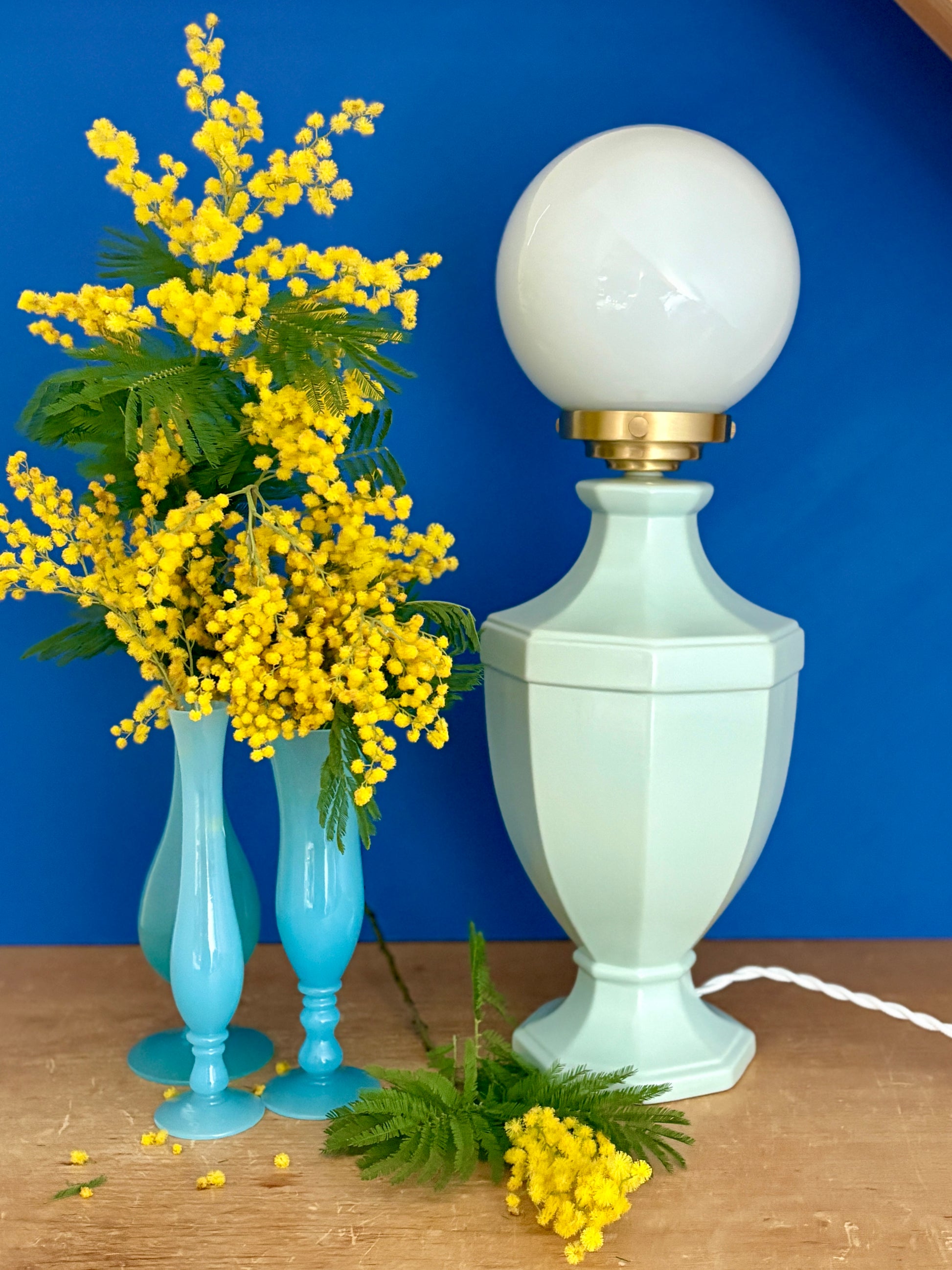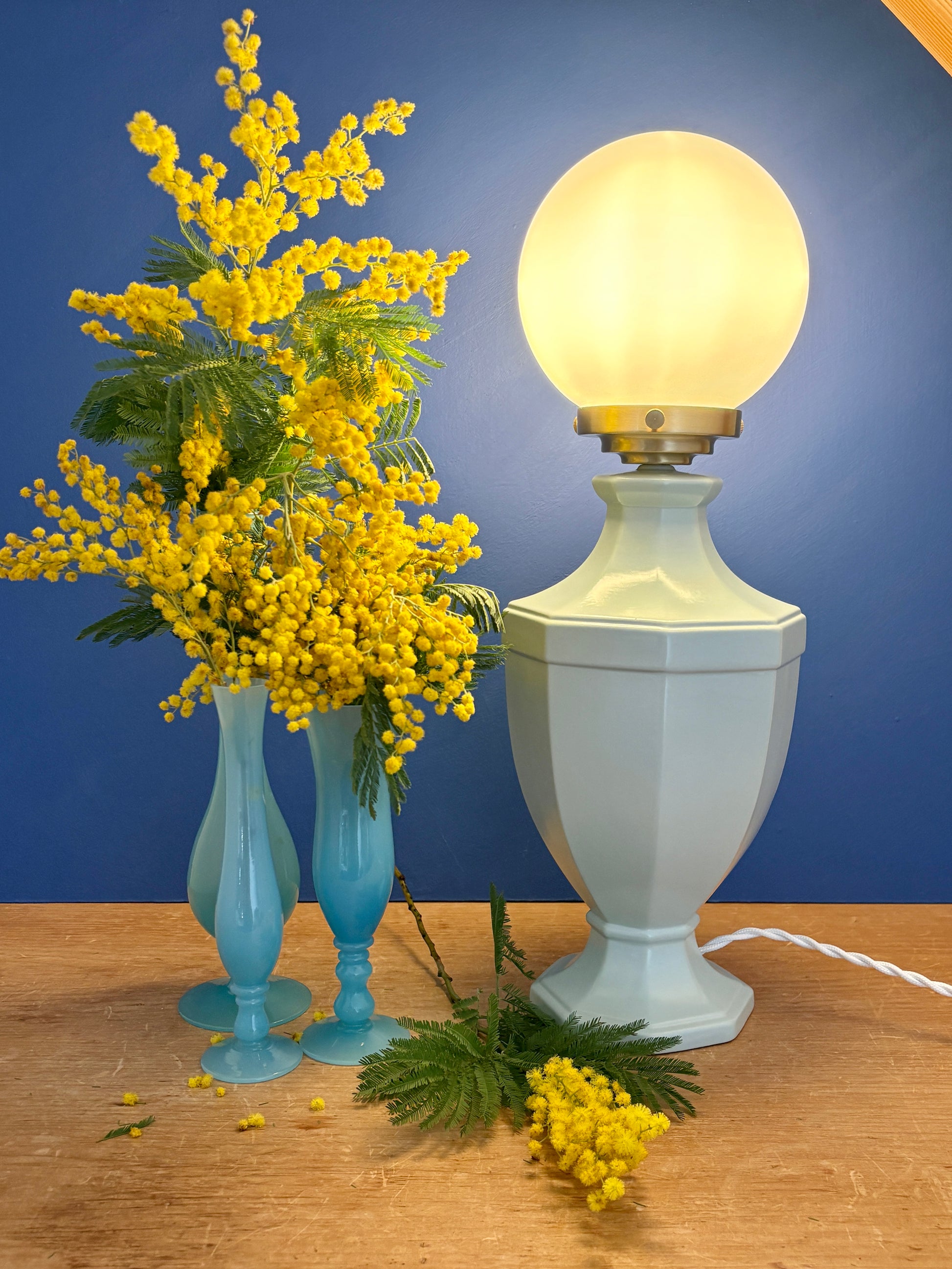Lampe à poser vintage en céramique bleue et opaline blanche