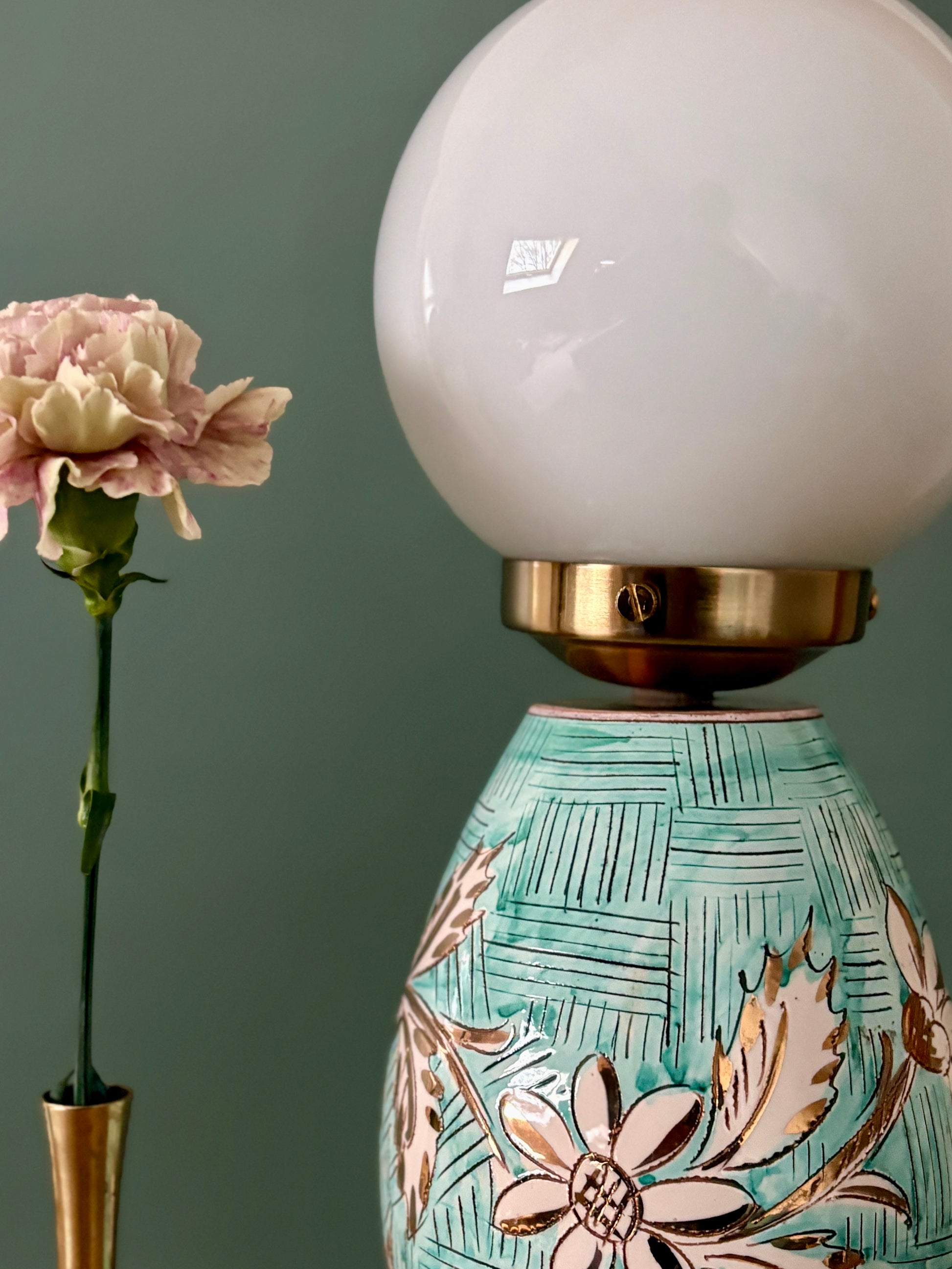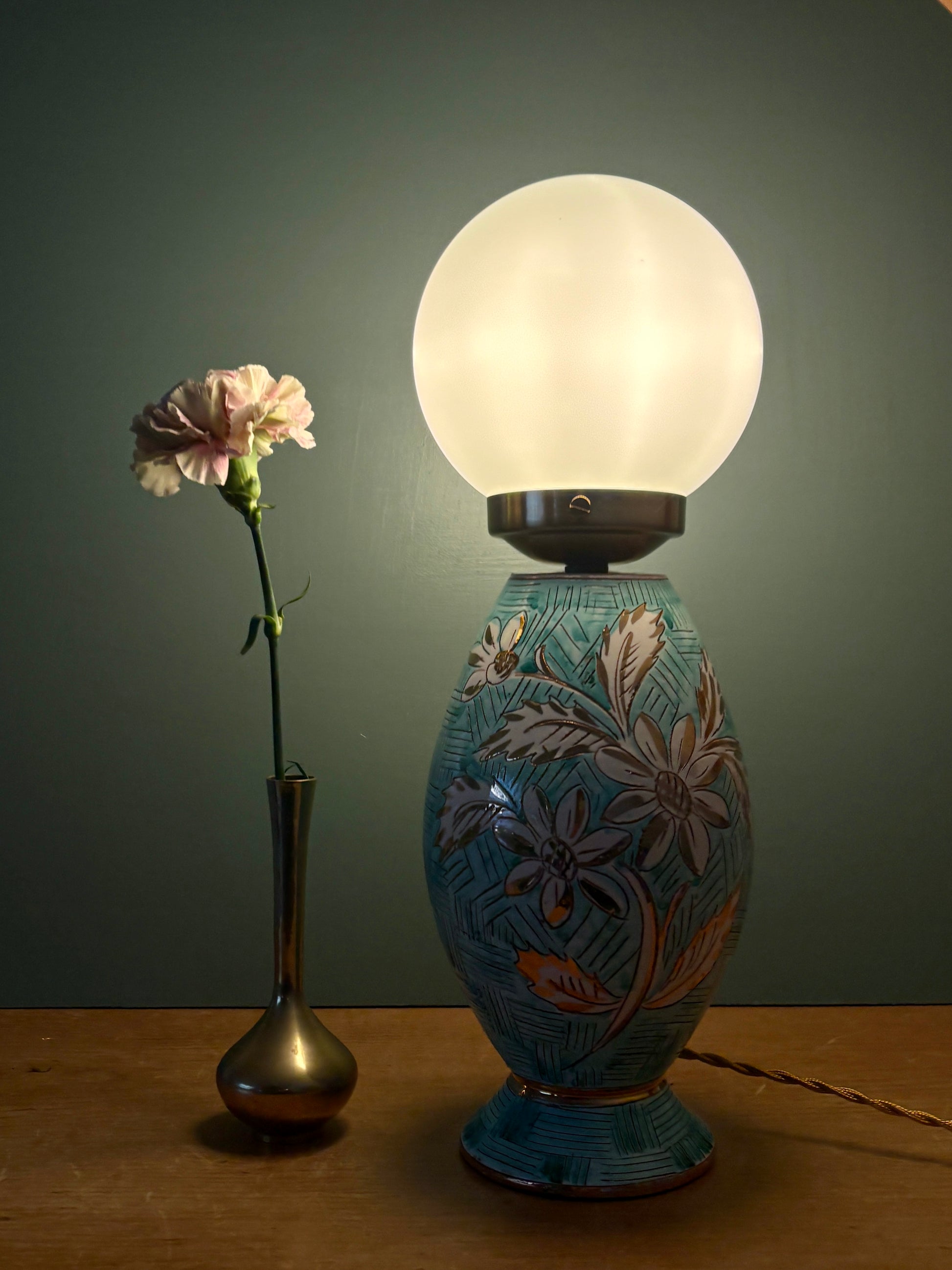 Très belle lampe composée d'un pied en céramique et d'un globe en opaline blanche, le tout vintage.