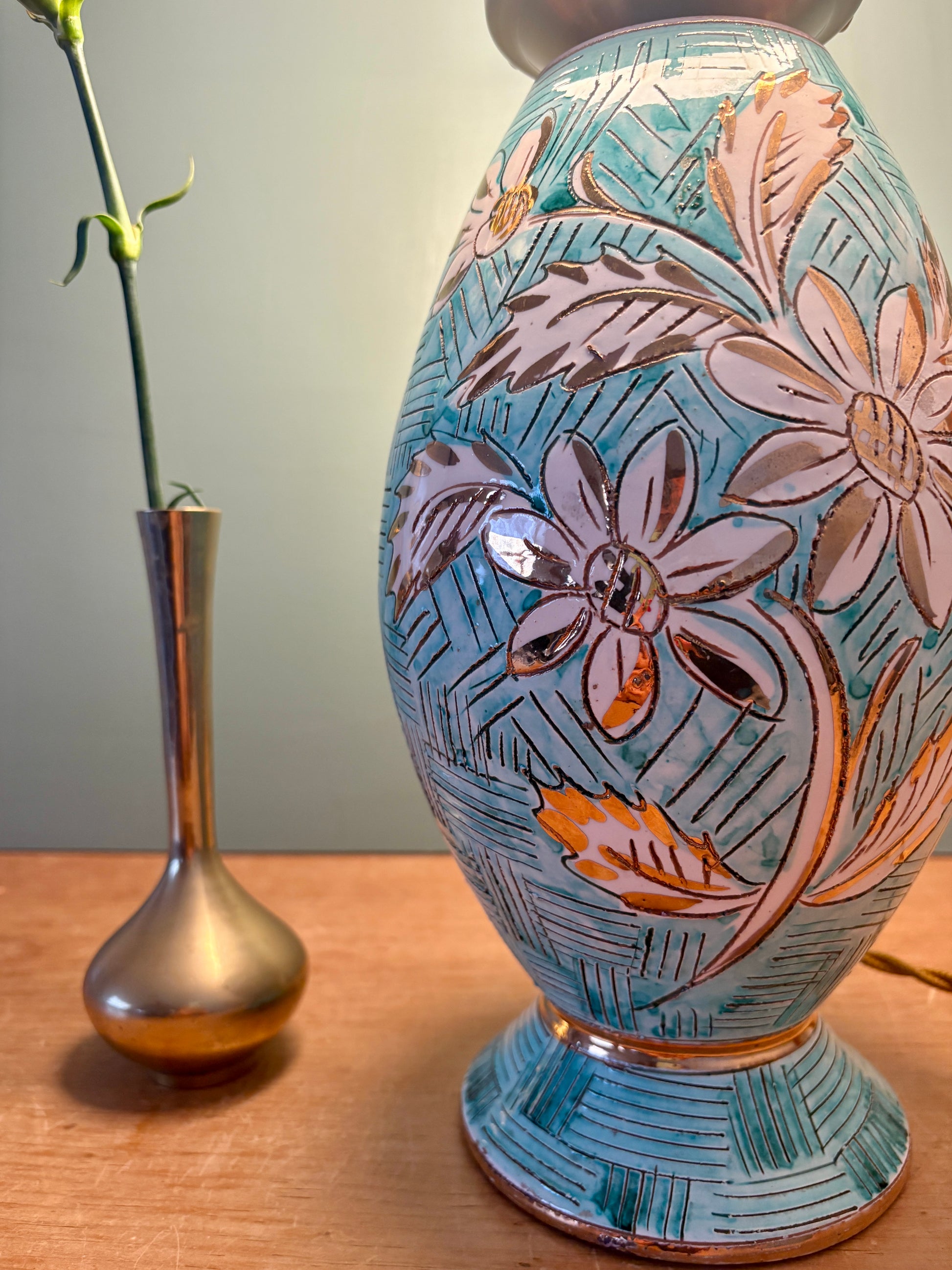 Pièce unique. Décors de flerus dorées sur fond turquoise sur le pied.